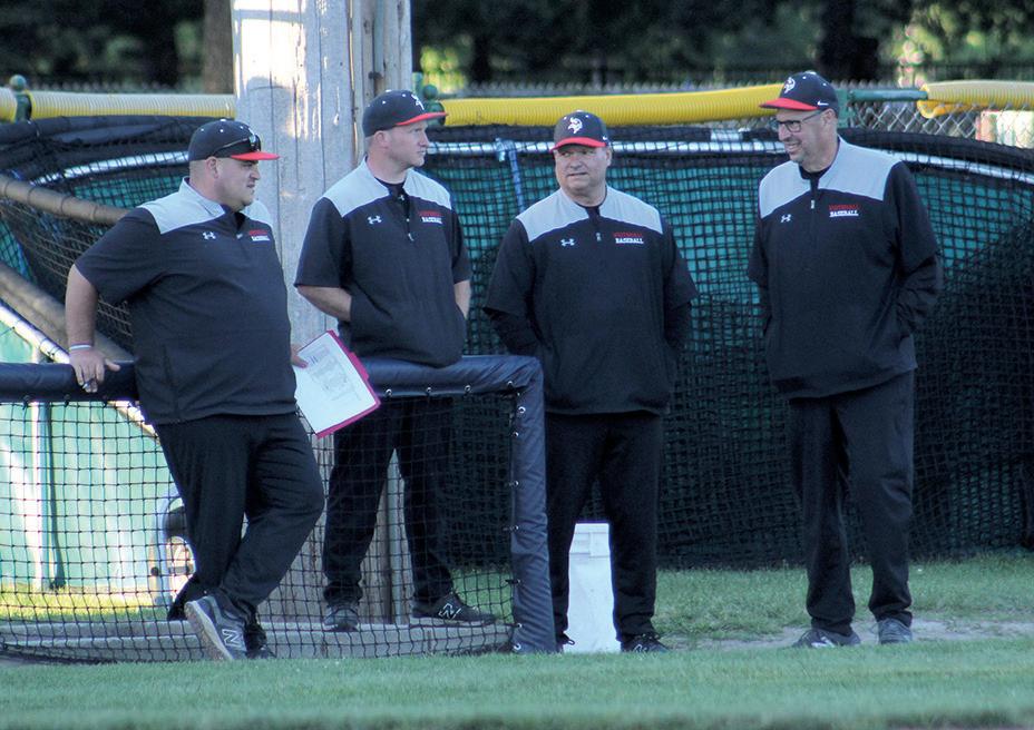 The Whitehall coaching staff (far left) meets up between innings of Monday’s Marsh Field All-Star game. Above, Ryne Christensen (right) celebrates scoring a run with Blue teammate Paxton Borgman of Fremont. Near left, Reeths-Puffer’s Trent Reichert winds up to make a pitch during the game. The Blue team won, 8-6.