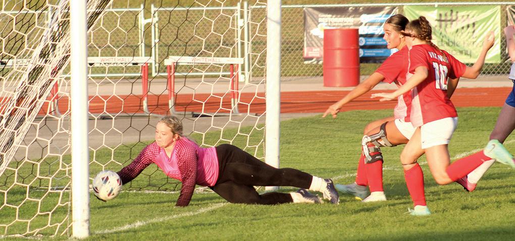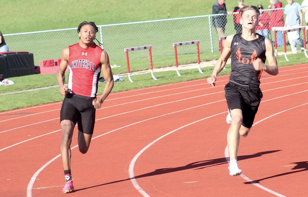 event wins in the double dual, including a new PR by Aaliyah Jamison in shot put. The freshman posted a 31-5 in the event to take the top spot. Arianna Black added a win in high jump with a leap of 5-0. Cami Kraai earned Whitehall’s third win and set a PR of her own in the 3,200 meters, crossing the line in 12:14.5.