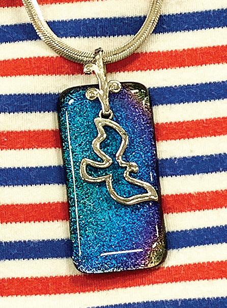 Elaine Oomen, far left, works on a gazing ball at the Pentwater Artisan Center. Whitney Atchetee, at left, rebuilt a bench for the Antler Bar at the PAC. Juanita Pierman made the fused glass pendant seen above.