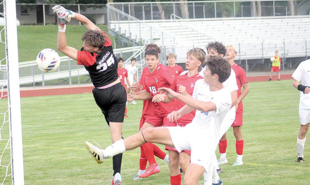 Montague's Jonah Henderson tries to come up with the ball out of the air during Wednesday's WMC game against Hart. The Wildcats lost, 4-3.