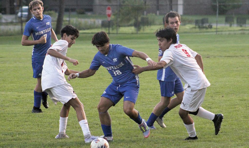 Above, Montague's Isaiah King goes down while battling a Hart opponent for possession during Wednesdy's WMC game at Montague. Below, the Wildcats' Korben Sanchez works his way between Hart defenders with the ball. Montague lost a close battle, 4-3.