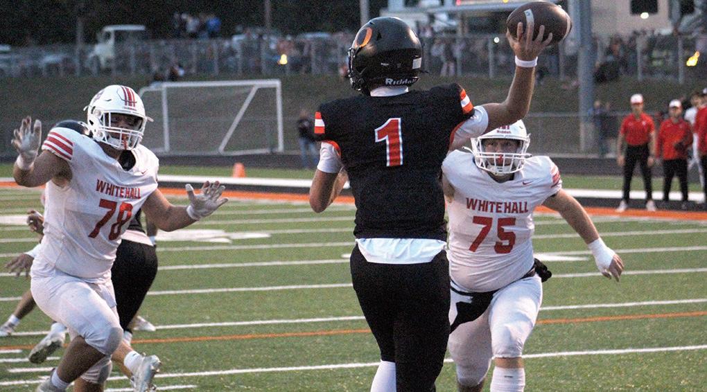 Whitehall's Caden Bowyer (78) and Jamison Jeffery try to chase down Ludington quarterback Cameron Gunsell as Gunsell lofts a screen pass during Friday's WMC Lakes game at Ludington. Gunsell had 283 yards of offense in his team's 32-7 win. • Andy Roberts/Mirror