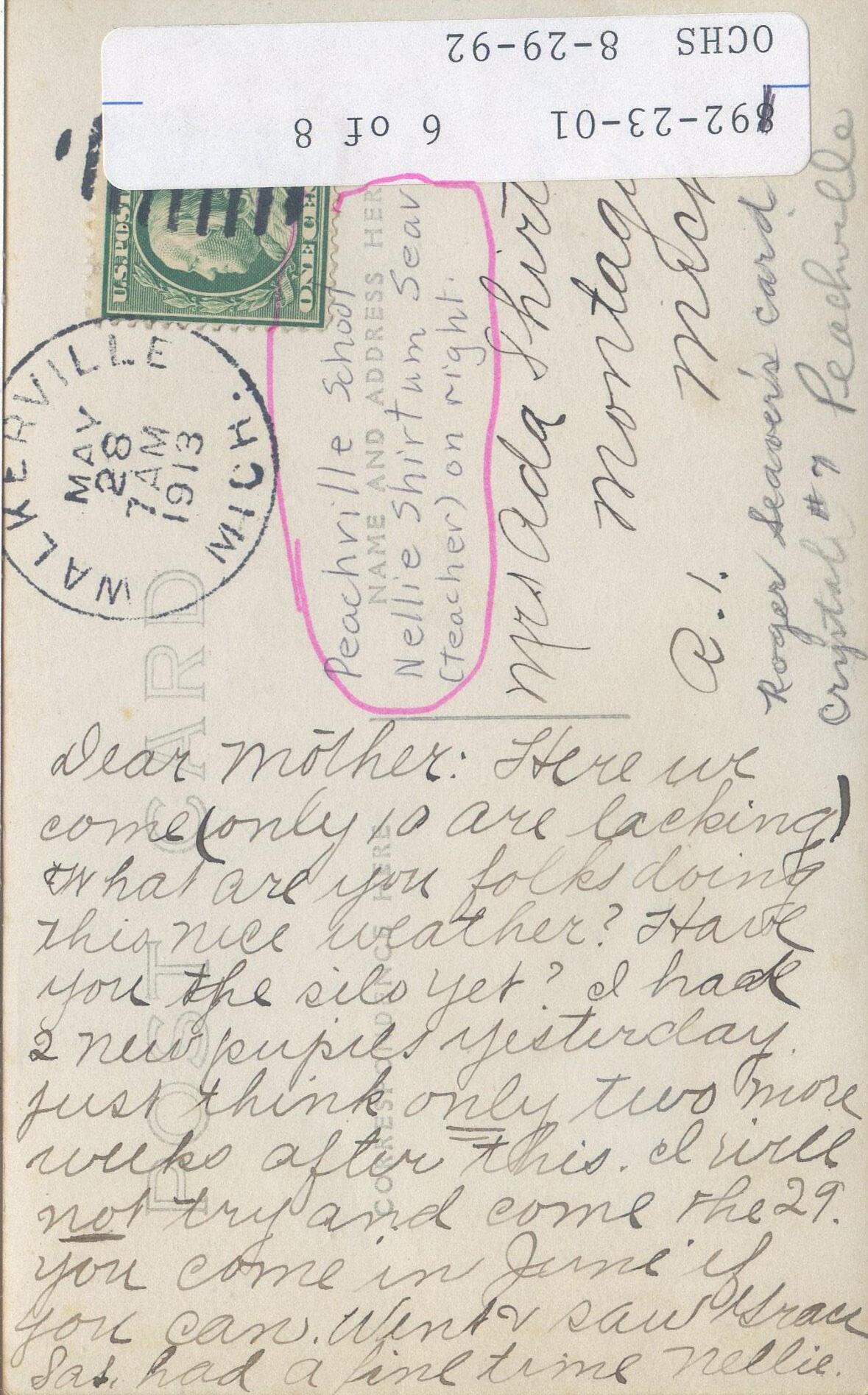 Postmarked May 28 in Walkerville, the card was sent to a Mrs. Ada Shirtum of Montague, Michigan, and reads as follows:
