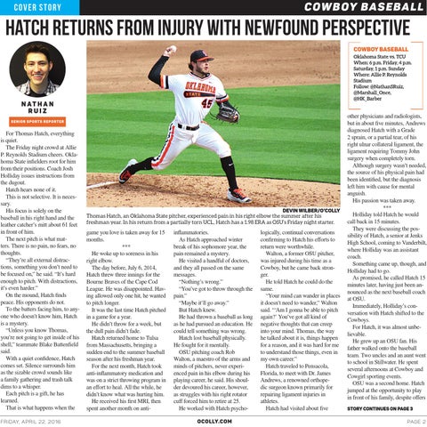 other physicians and radiologists, but in about five minutes, Andrews diagnosed Hatch with a Grade 2 sprain, or a partial tear, of his right ulnar collateral ligament, the ligament requiring Tommy John surgery when completely torn. Although surgery wasn’t needed, the source of his physical pain had been identified, but the diagnosis left him with cause for mental anguish. His passion was taken away. *** Holliday told Hatch he would call back in 15 minutes. They were discussing the possibility of Hatch, a senior at Jenks High School, coming to Vanderbilt, where Holliday was an assistant coach. Something came up, though, and Holliday had to go. As promised, he called Hatch 15 minutes later, having just been announced as the next baseball coach at OSU. Immediately, Holliday’s conversation with Hatch shifted to the Cowboys. For Hatch, it was almost unbelievable. He grew up an OSU fan. His father walked onto the baseball team. Two uncles and an aunt went to school in Stillwater. He spent several afternoons at Cowboy and Cowgirl sporting events. OSU was a second home. Hatch jumped at the opportunity to play in front of his family, despite offers STORY CONTINUES ON PAGE 3