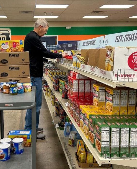John Moran stocks shelves at Our Daily Bread before a shopping session.