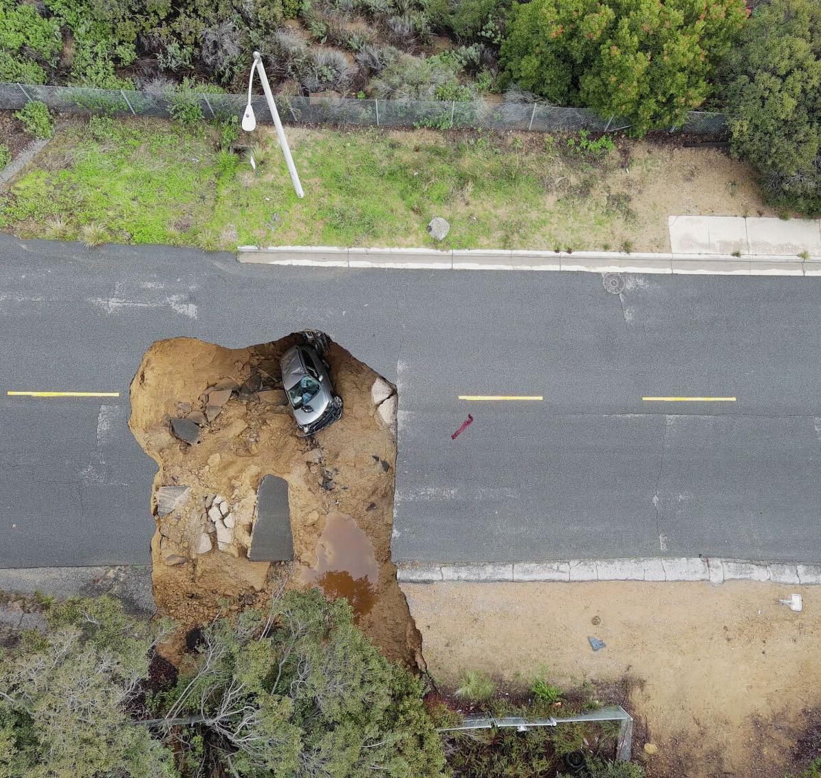 This aerial view shows two cars sitting in a large sinkhole that opened during a day of relentless rain, on Jan. 10 in the