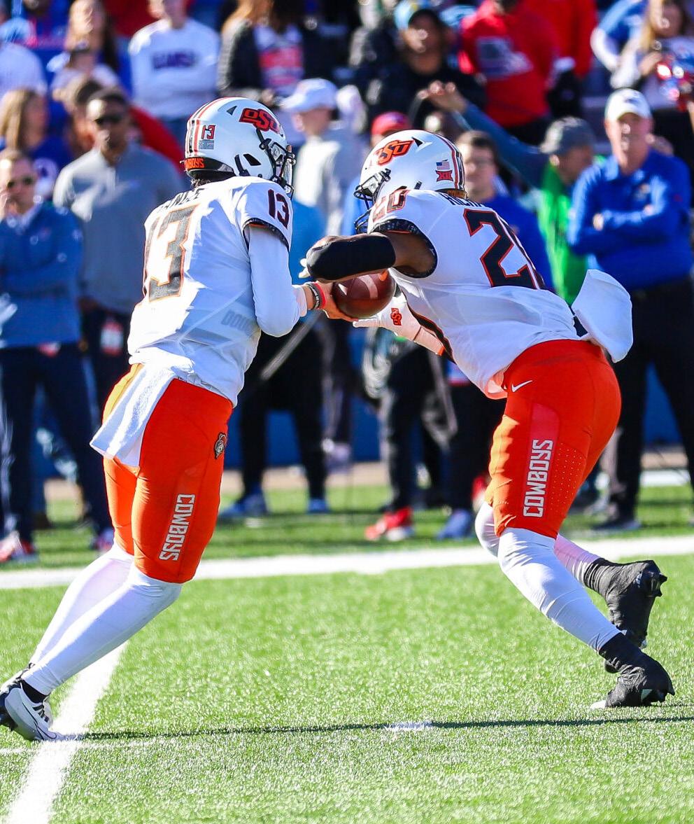 Oklahoma State Cowboys Oklahoma State dropped its second straight game in a three-score loss to the Kan sas Jayhawks. Without starting quarterback Spencer Sanders, the Cowboys receivers needed to step up if they wanted a chance to win. Sophomore receiver Bryson Green did just that, and even though they lost he finished with nine catches for 105 yards.