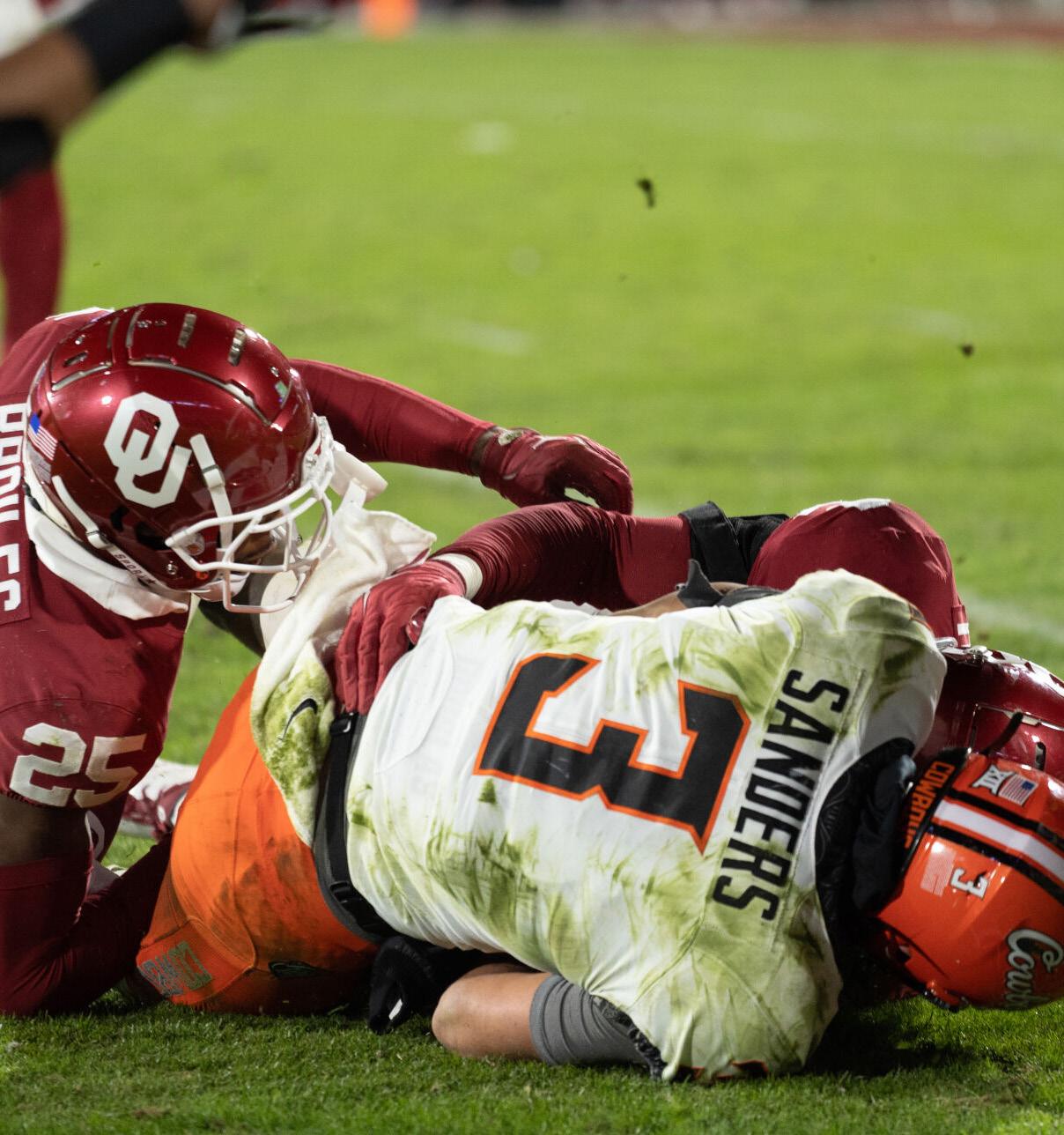 After 15 min utes, the jersey stained green. A fragment of his gray undershirt ripped. It flapped as he ran. Oklahoma didn’t let Sanders, OSU’s quarterback, out of its grip.