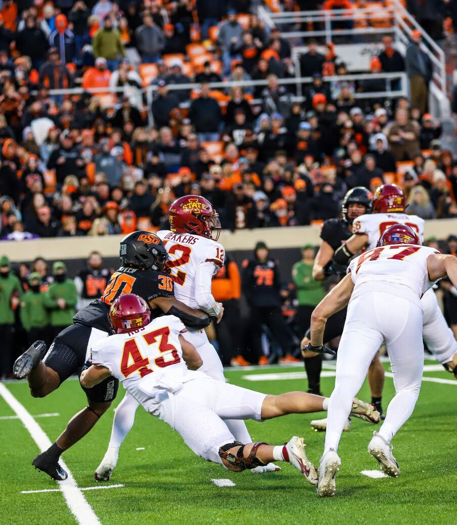 With 2:09 remaining in the game, Iowa State got the ball back trailing by six points. The Cyclones advanced all the way to the OSU 29 before Cowboy defensive end Collin Oliver dragged down Cyclone quar terback Hunter Dekkers for a game-clinching sack.