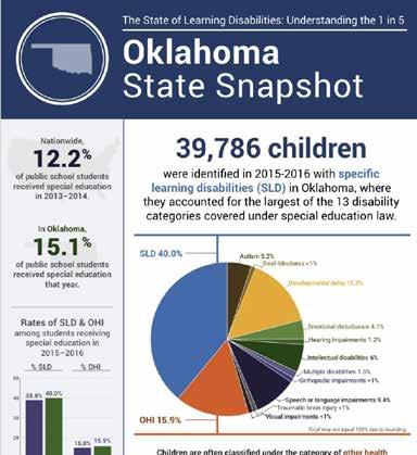 In 2016, 39,786 children were identified with spe cial learning disabilities in Oklahoma, according to the National Center for Learning Disabilities. The children ac counted for the largest of 13 disability categories covered under special education law.