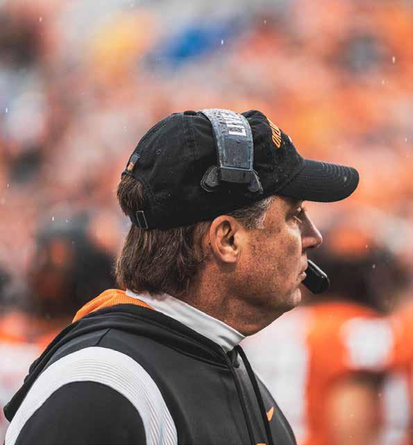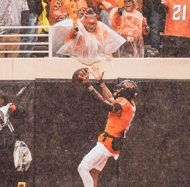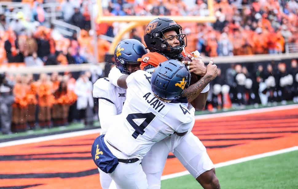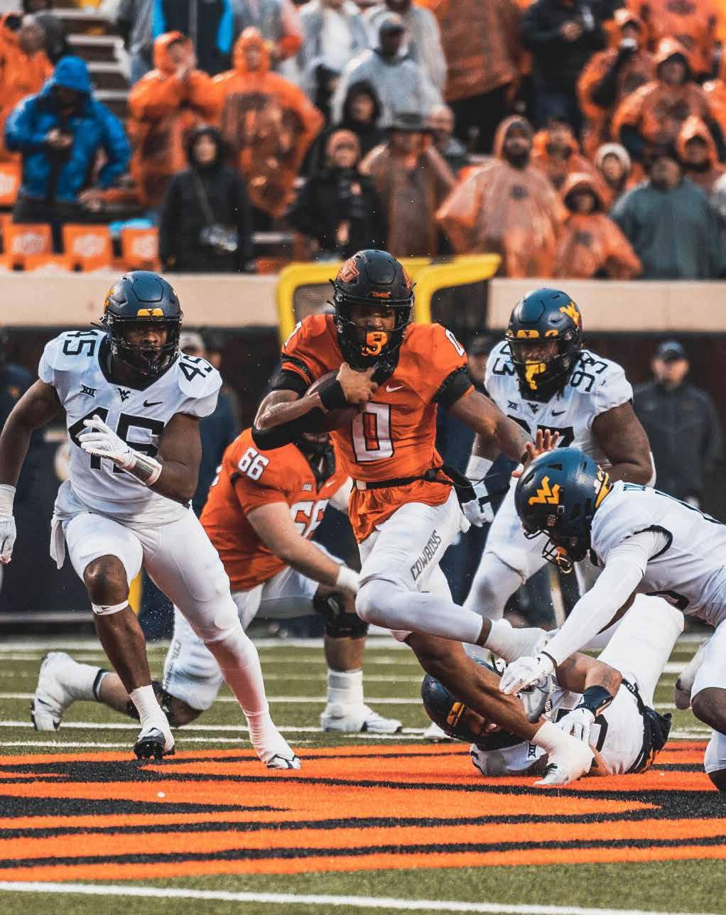 hands of West Virginia in their last home game of the season. For the senior day festivities, the Cowboys donned black helmets bosting the brand logo, orange jerseys and white pants. This marks the second time the Cowboys have gone tri-color this sea son, both ending in losses respectively. The last and only other time the Cow boys have worn the black, orange and white in the modern uniform era came during a homecoming victory against Kansas the previous season. This makes the Cowboys a coin flip wearing this tri-color look, boasting one win and one loss respectively.