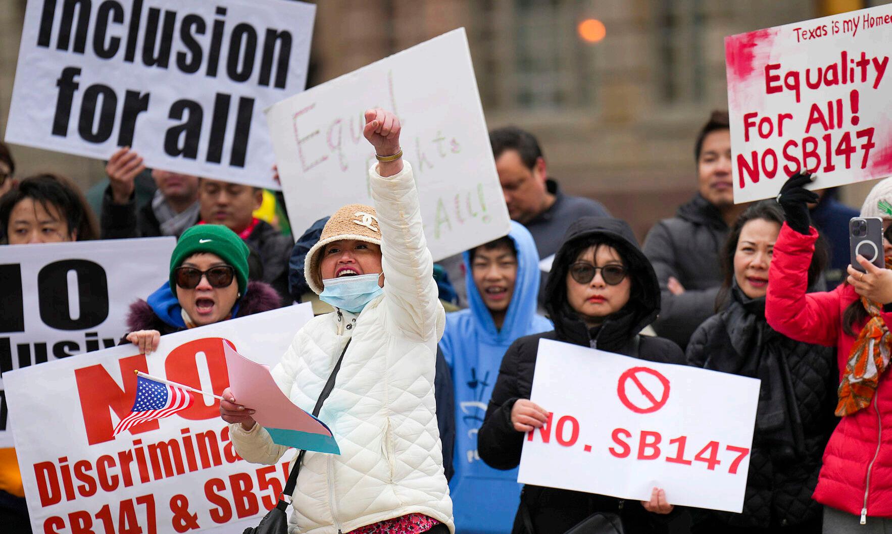 Mingling Huang (in white) raises a fist as she yells in agreement with a speaker during a rally in opposition to Texas Senate Bills 147 and 552 on Sunday, Jan. 29, 2023, in Dallas. (Smiley N. Pool/The Dallas Morning News/TNS)