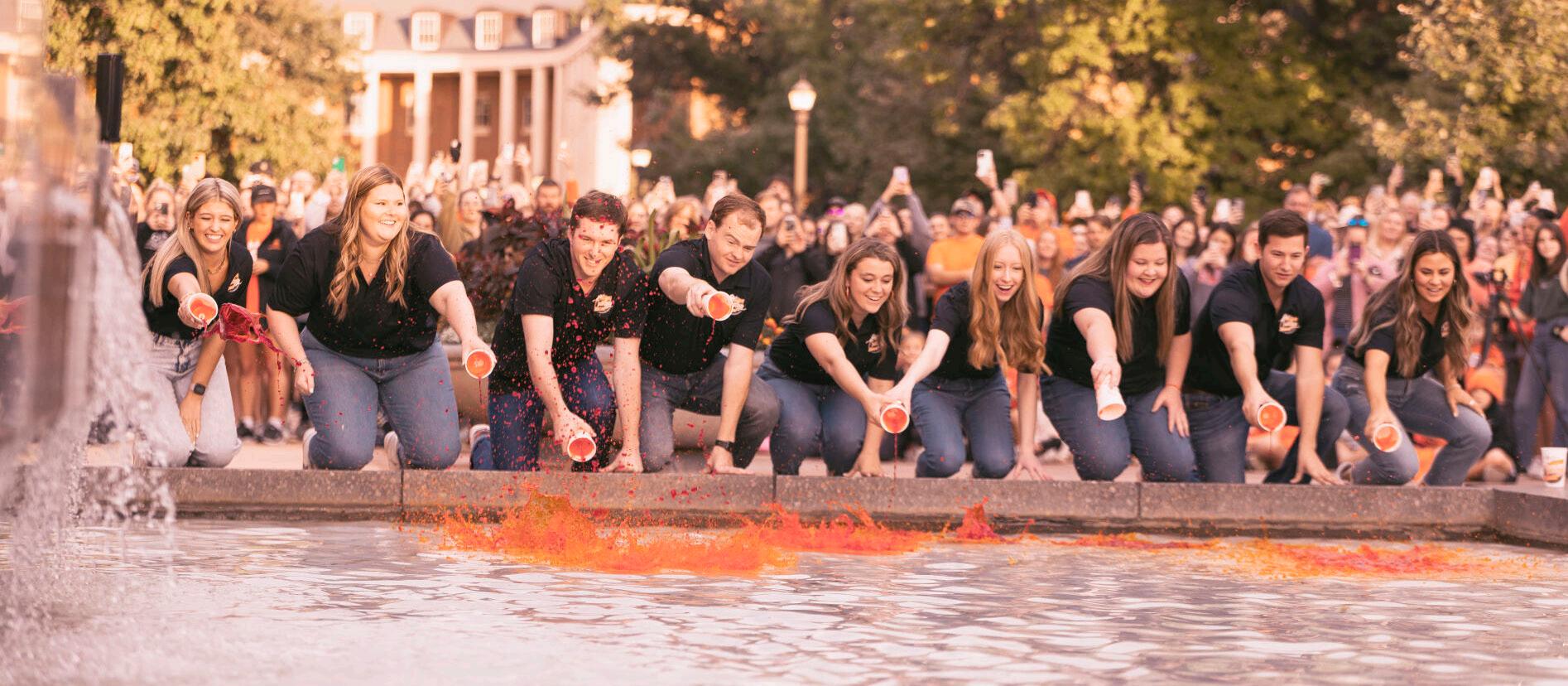 The Homecoming executive team pours the first round of orange dye into the fountain.