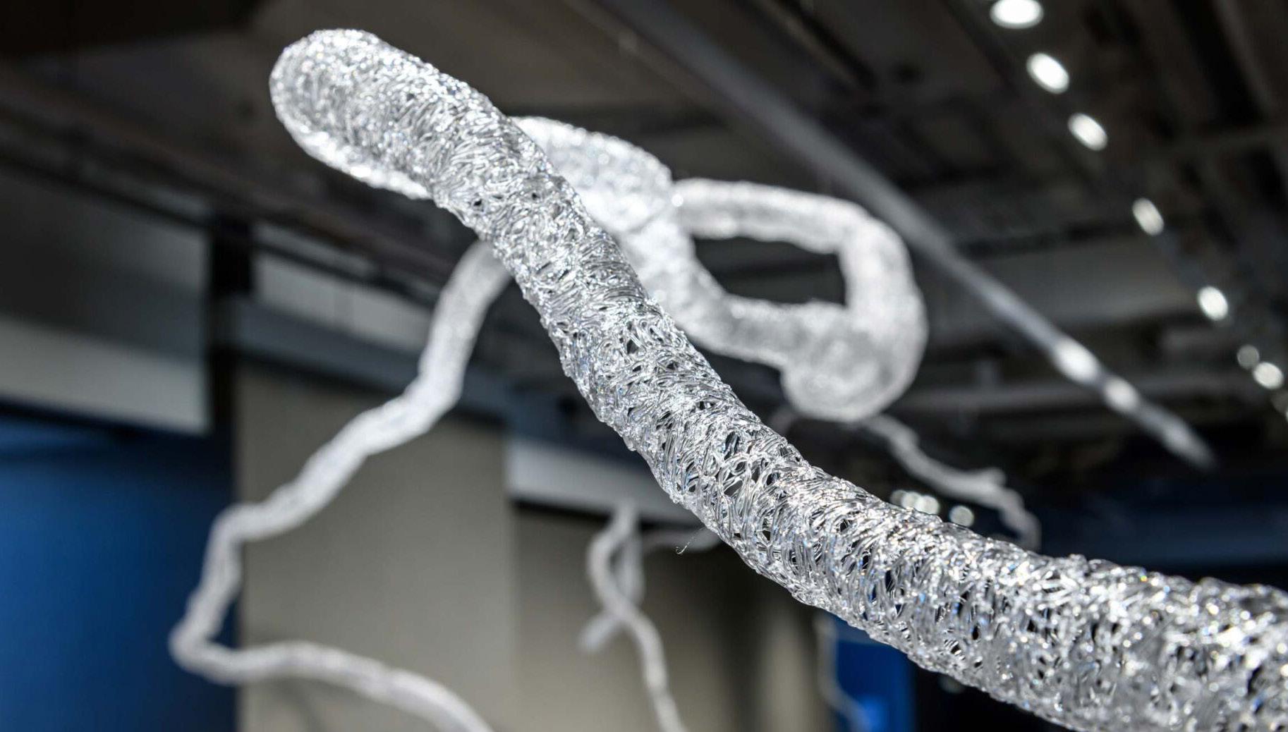 Entitled “Ripple,” the exhibit boasts three sculptures made of PETG plastic, which uses a 3D pen and monofilament. The sculptures are hung from the ceiling by invisible fishing wire. The appearance makes it seem as if the sculptures are floating.