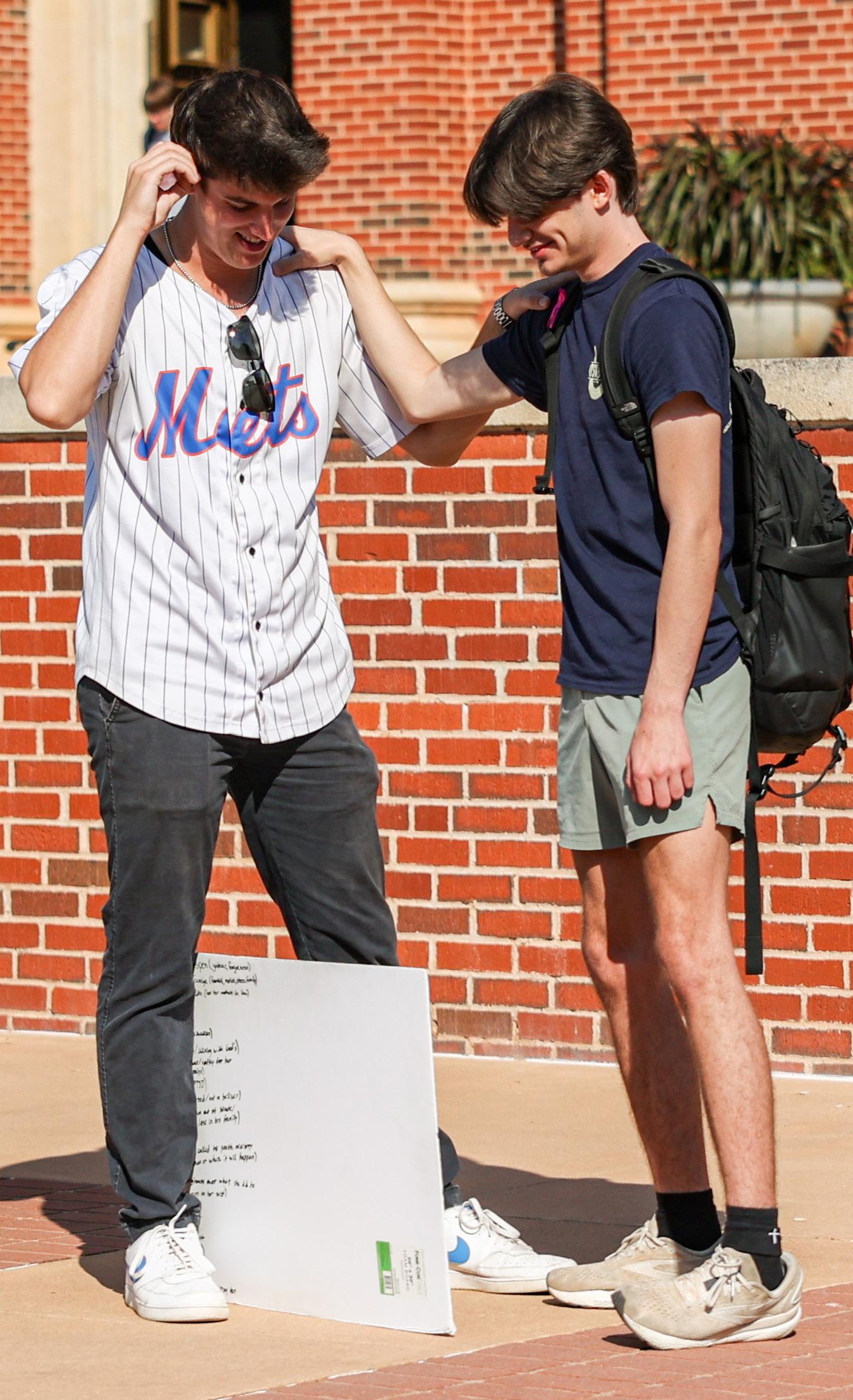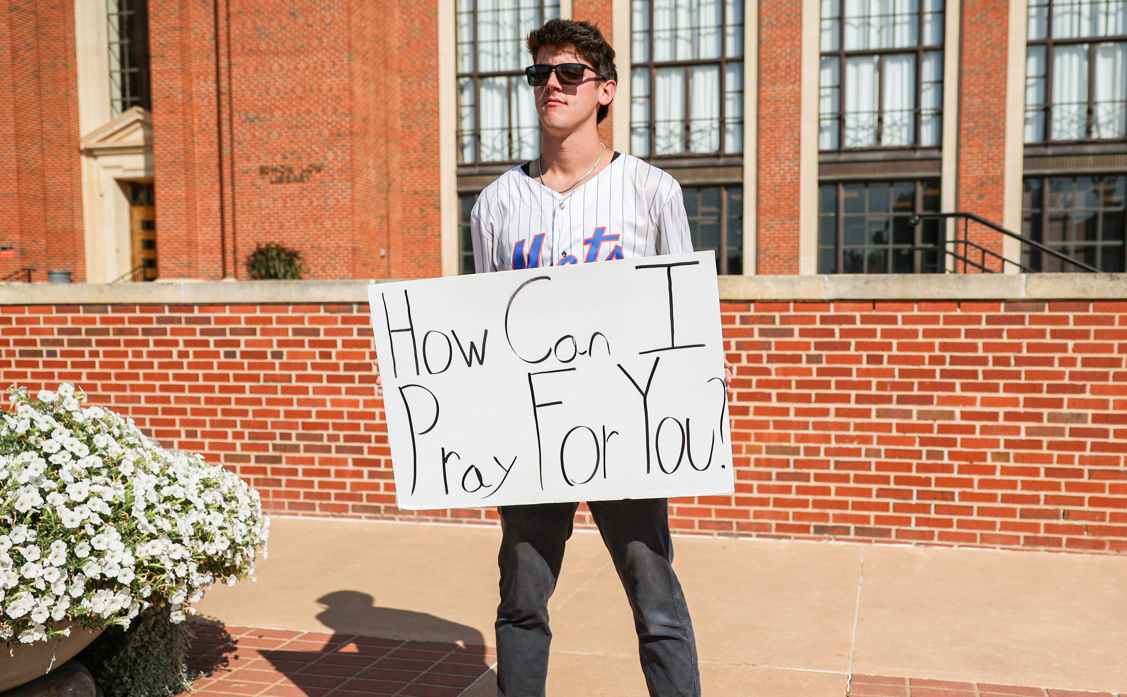 Most afternoons near the library, students walk past a man holding a white posterboard that reads, “How Can I Pray For You?” in thick black Sharpie. Some stop. Some glance. Others circle back a few minutes later.
