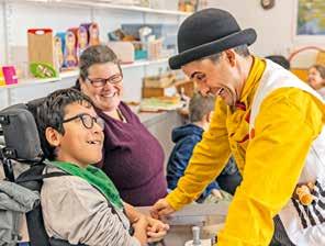 comme des vols. Les situations et les histoires sont inventées de concert. L’humour et le talent d’improvisation dont font preuve les artistes créent des moments si drôles qu’ils resteront sûrement à jamais gravés dans les mémoires. Dans les établissements accueillant des enfants atteints d’un handicap, rire a un effet plus que positif sur la santé. Nadia Alessio, directrice adjointe et pédagogue curative du centre scolaire spécialisé de Wenkenstrasse, nous a confié : « Les enfants se réjouissent toujours beaucoup de voir ‘Monsieur et Madame Rêves’. Les artistes captivent immédiatement les enfants. Lors de la visite, les enfants rient énormément. En leur compagnie, les enfants osent essayer de nouvelles choses et se montrer sous un tout autre jour ». C’est l’heure de partir. Les enfants et les artistes quittent la pièce. Amaru sort avec sa chaise roulante et pousse les deux Messieurs Rêves encore un long moment. « Au revoir, merci ! »
