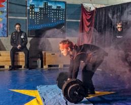 Sous le regard de Sturzman et du public, ce garçon montre sa force surhumaine.