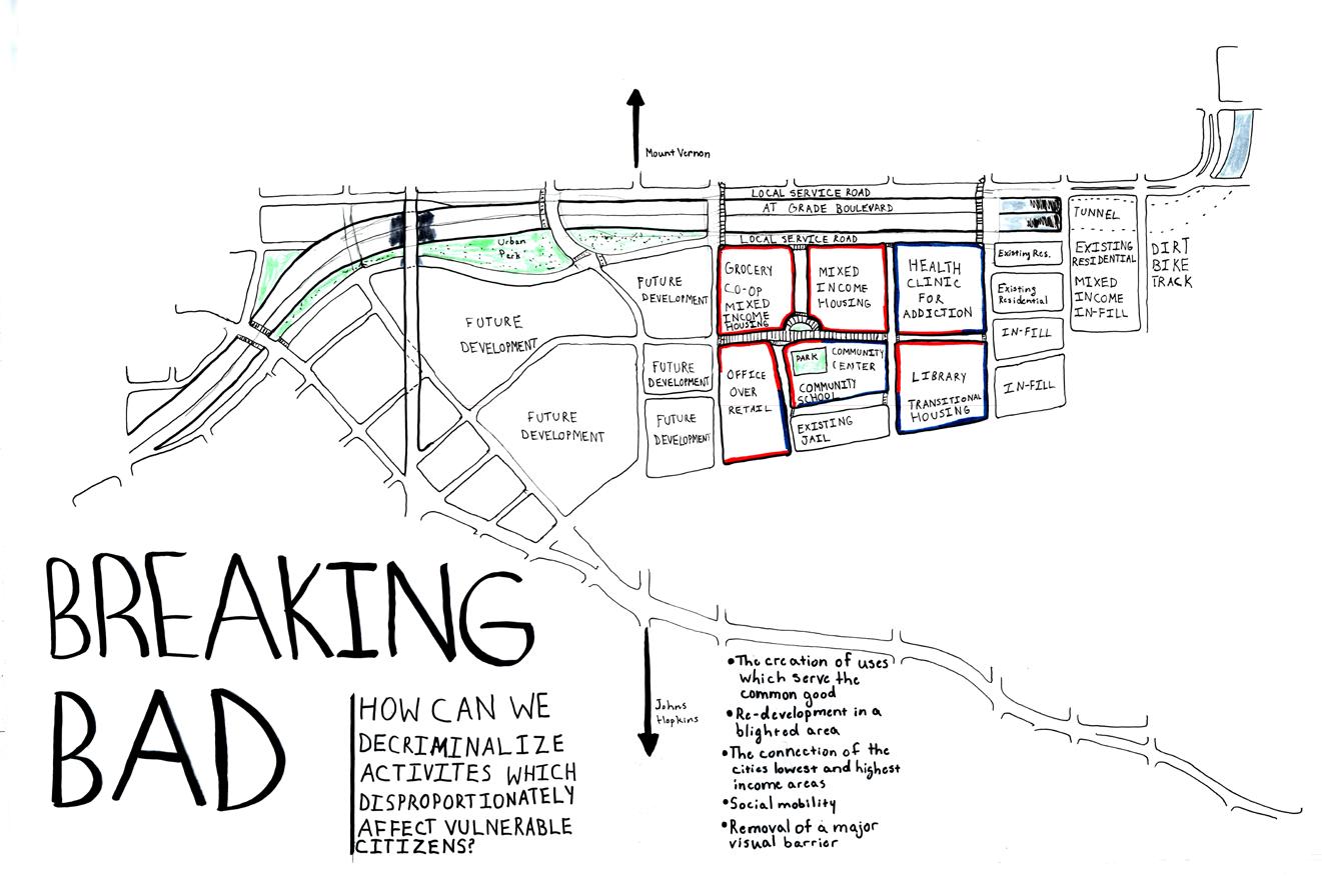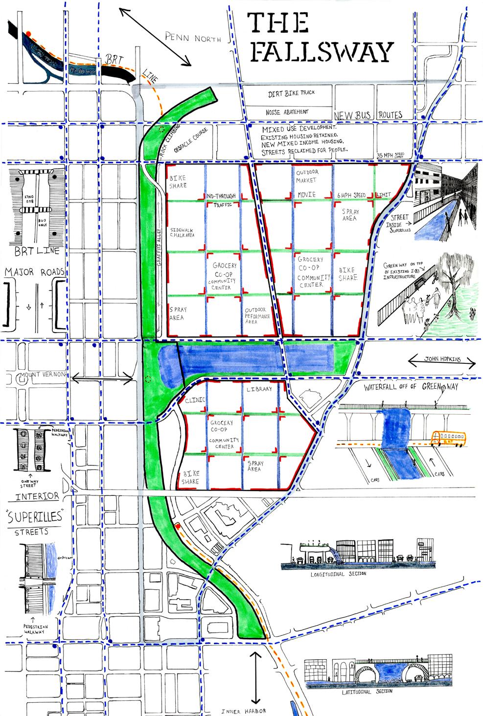 This project seeks to address the problems facing an innercity community in Baltimore, MD by proposing a large scale redevelopment framework that focuses on transportation, growth, and investment. Through research and precedent, my partners and I have broken down the site improvements into re-investment districts in addition to a linear “greenway” park, bus rapid transit, and the daylighting of the Jones Falls River.