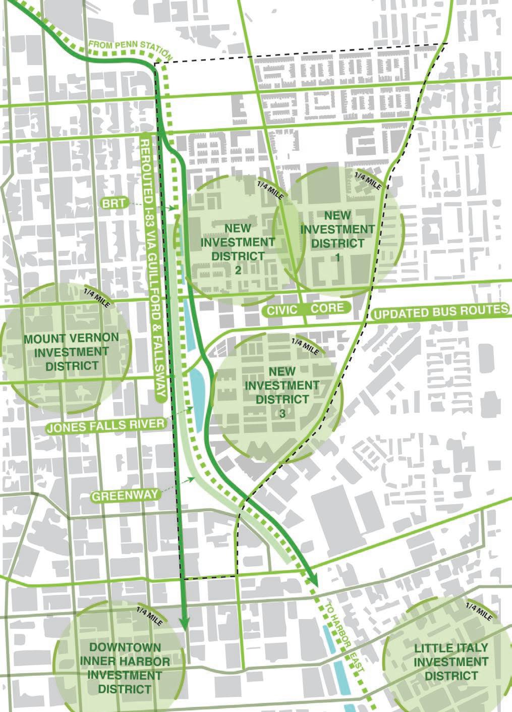 URBAN PARK & PAVILION 7. DAY-LIT JONES FALLS RIVERBED (URBAN STORMWATER FEATURE) NEW INVESTMENT DISTRICTS Improvements based on 1/4 mile walkshed EXISTING JUVENILE JUSTICE CENTER 1 1 1 2 2 2 1 4 4 6 5 4 4 4 4 1 1 4 1 1 1 4 7 HEALTHCARE FOR THE HOMELESS 1 1