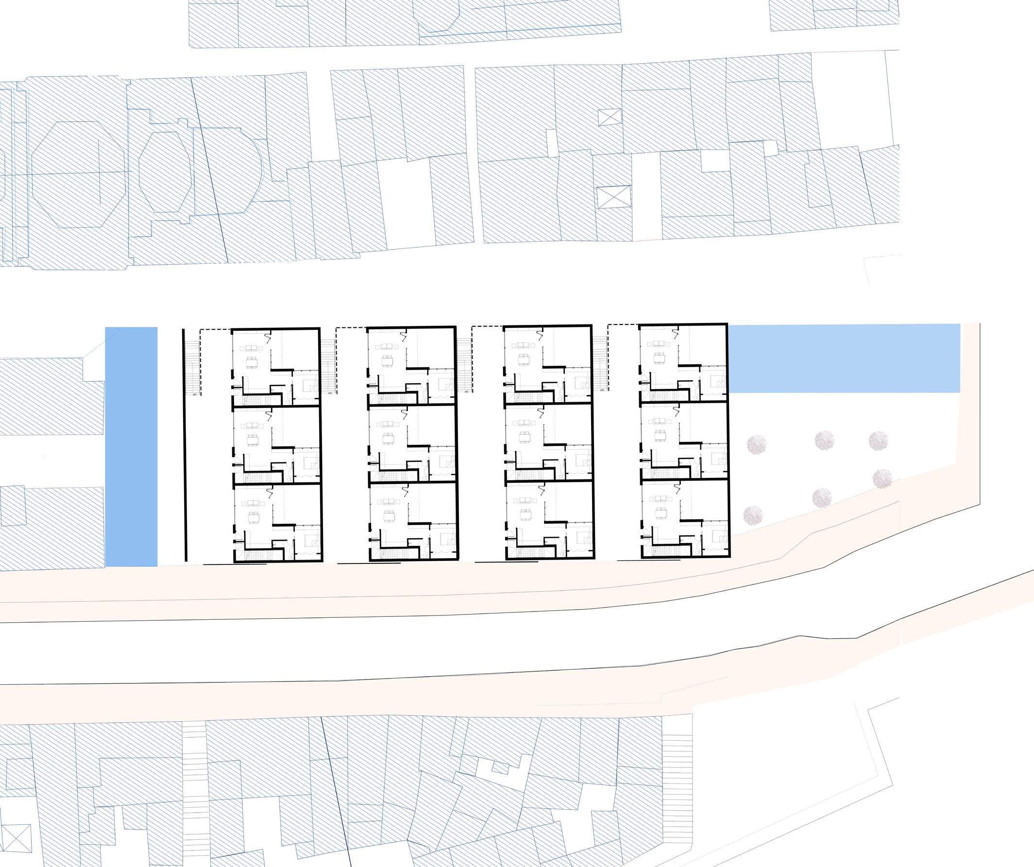 The intent of the International Housing studio is to understand the design implications of a variety of cultural and climatic conditions. This project represents the design of a series of co-housing units located in the city of Cagliari, Italy. This mediterranean climate requires design responses that address the need for cross ventilators but also serve as gathering points that define levels of privacy. This element is that of the patio/terrace. A contemporary element has also been added in the use of polycarbonate screens as mediators of privacy to the City of Cagliari. The historic urban design rules of the city have caused further restraint. A more intimately scaled unit assemblage of six stacked flats became the appropriate design solution. However, once aggregated upon the site, a greater number is possible while still retaining individual identity amongst the collection of residents.