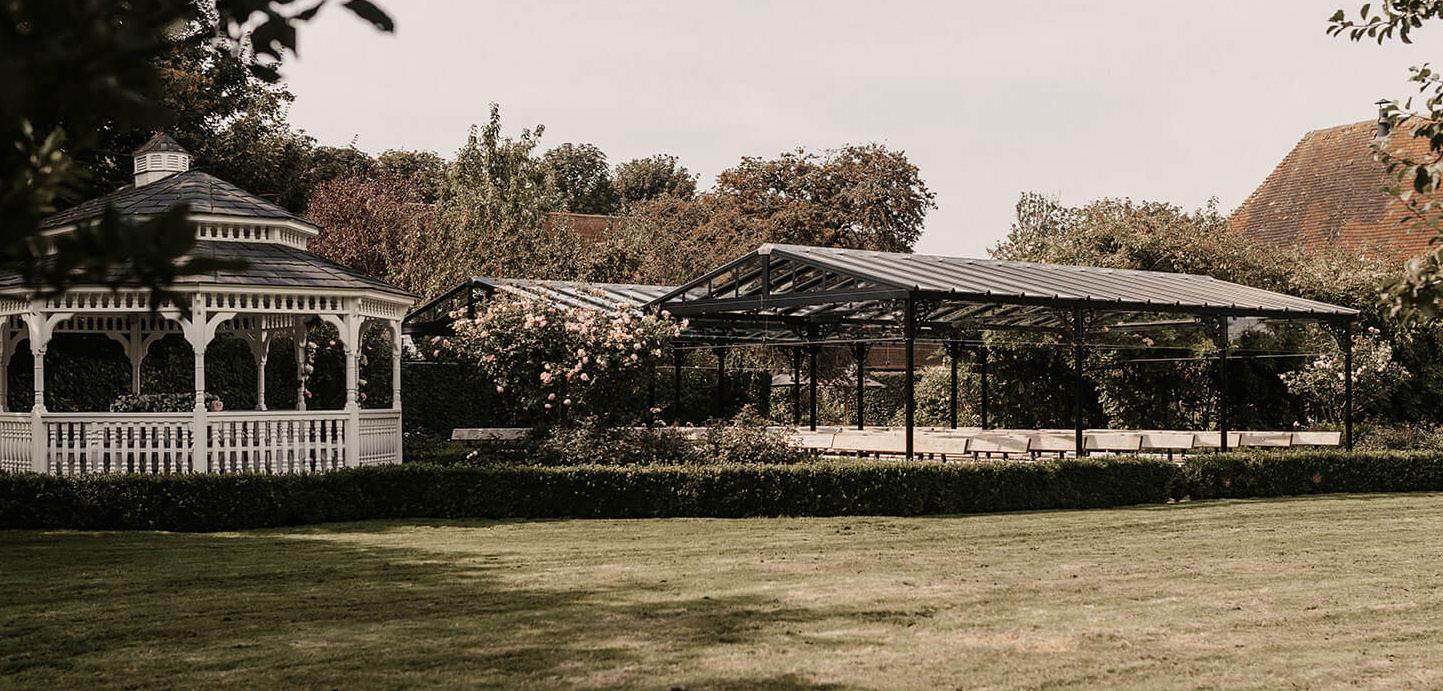 There are two ceremony locations. The outdoor ceremony seating area is covered by glass pergolas that have a UV filter. The indoor ceremony area is inside the New Barn. The ceremony location is determined by the weather/season and the couple’s wishes.