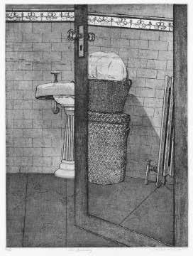 30. (left) The Laundry. Etching and aquatint, 1977. Edition 50. Image size 15 3/4 x 11 3/4” (40 x 30 cm). Signed, titled, and dated in pencil. Good condition. Water stain upper right edge of paper. #99230-1 $375.00