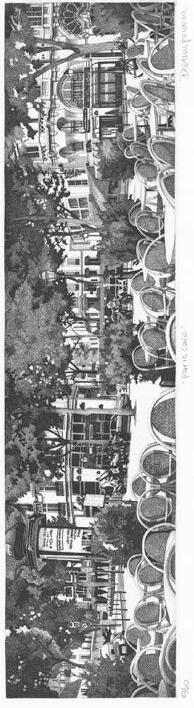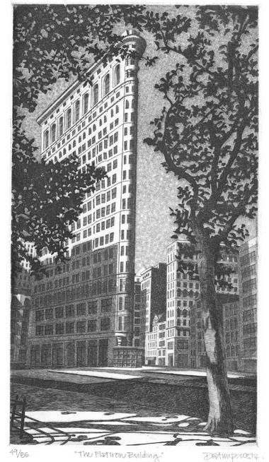 Prosia’s commitment to printmaking came in 1988 when she met Chicago printmaker, Phillip C. Thompson, whose architectural style, line work and tone caught her eye. Over a three-day period, he taught her the basics of printmaking. On the fourth day, she ordered her first printing press from Blick, set it up in her studio apartment, and got to work creating etchings. In 1990, with Thompson’s help, she started doing weekend art festivals.