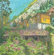 27. (left) Hillside Hideaways. Watercolor with colored pencil, 2025. Image size 7 x 7” (18 x 18 cm). Signed i with black pencil lower left in image. Signed and titled in pencil on verso. Very good condition. ##102729-1 $475.00