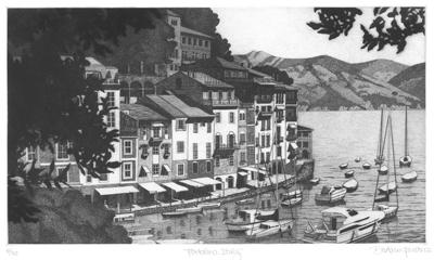 39. Portofino, Italy. Etching, 2024. Image size 7 3/4x 13 3/4” (19.7 x 35 cm). Signed and titled in pencil. Edition 30. Very good condition. #101903-1 $375.00