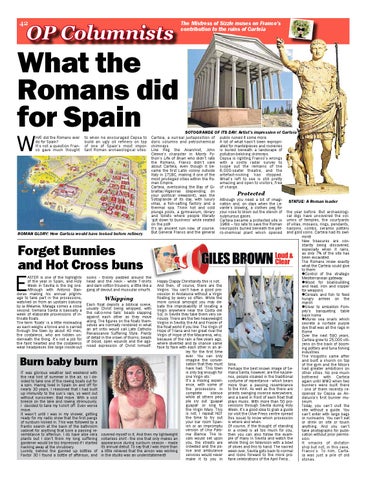 the year before. But archaeological digs have uncovered the columns of temples, the courtyards of villas, mosaics, rings, pendants, hairpins, combs, ceramic pottery and gold coins. Carteia had its own mint! New treasures are constantly being discovered, especially when it rains, as only 7% of the site has been excavated. The Romans knew exactly what the Carteia could give to them: lControl of the strategic Mediterranean gateway lWood for boat-building and lead, iron and copper for weapons lCereals and fish to feed hungry armies on the march lSilver to embellish Pompey’s banqueting table back home lMurex sea snails which secrete a no-fade purple dye that was all the rage in Rome Over the next 580 years, Carteia grew to 25,000 citizens on the back of booming pottery and tuna fishing industries. The Visigoths came after and built a church on top time. of the gym and the Moors Perhaps the best known image of Sehad greater ambitions on mana Santa, however, are the nazareother cities. No one much nos, people cloaked in the traditional bothered with Carteia costume of repentance - which bears again until WW2 when two more than a passing resemblance bunkers were built there to the KKK. As well as this there are - one of them recently repriests swinging incense everywhere, opened by Cepsa as Anand a band in front of each float that dalucía’s first bunker muplays music. With more than 50 proseum. cessions through Sevilla during Holy Today, you can’t visit the Week, it’s a good idea to grab a guide site without a guide. You (or visit the Olive Press centre spread can’t enter with large bags this issue) to know which procession or rucksacks. You can’t eat is where and when. or drink on site or touch Of course, if the thought of standing anything. And you can’t in a crowd is all too much for you, take photographs for publithen you can also follow the examcation without prior permisple of many in Sevilla and watch the sion. whole thing on television with a bowl It smacks of dictatorof olives and fino to hand. The sacred ship but not, in this case, week over, Sevilla gets back to normal Franco’s. To him, Carteand looks forward to the more proia was just a pile of old fane celebrations of the April Feria… stones.
