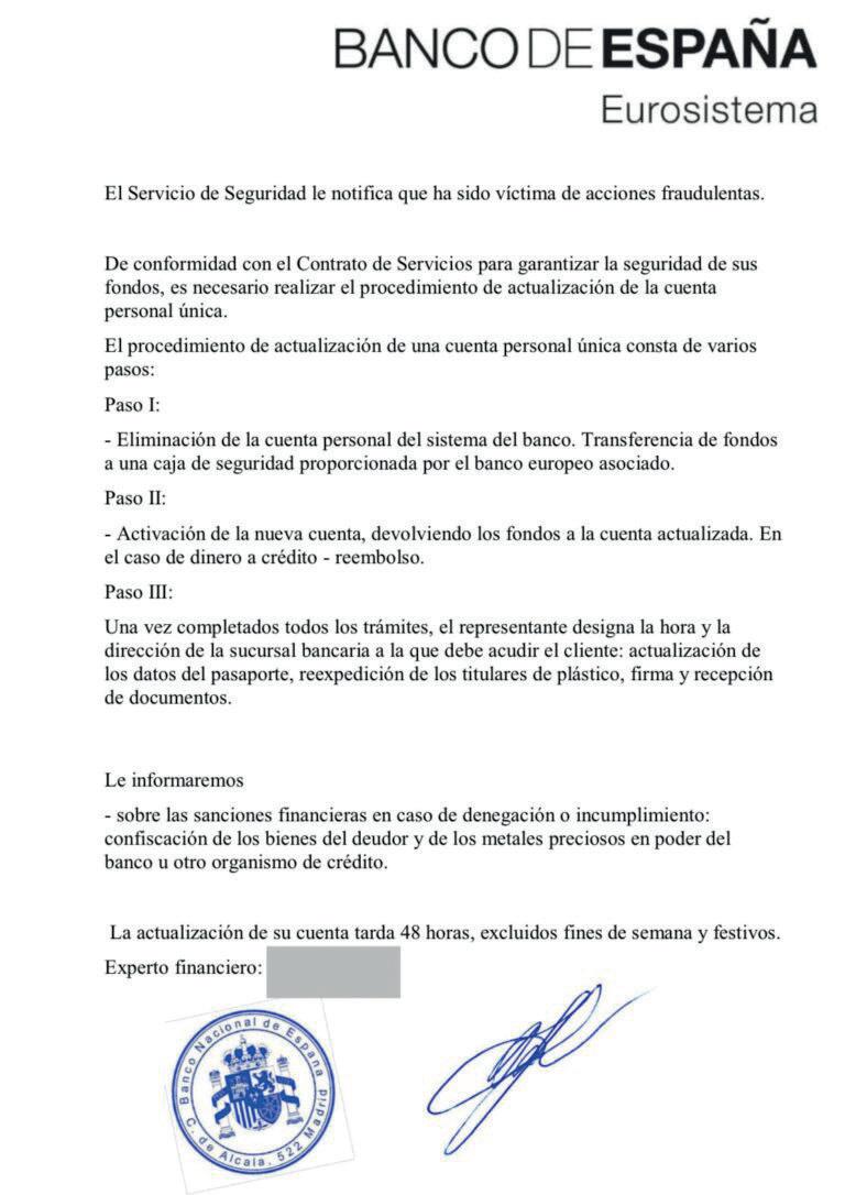 The scammers also sent the victim a photo of a Spanish police ID and a document bearing a Bank of Spain watermark (below) – both forged. “It was terrifying,” Elena continued. “They basically kept threatening me until I gave up.”