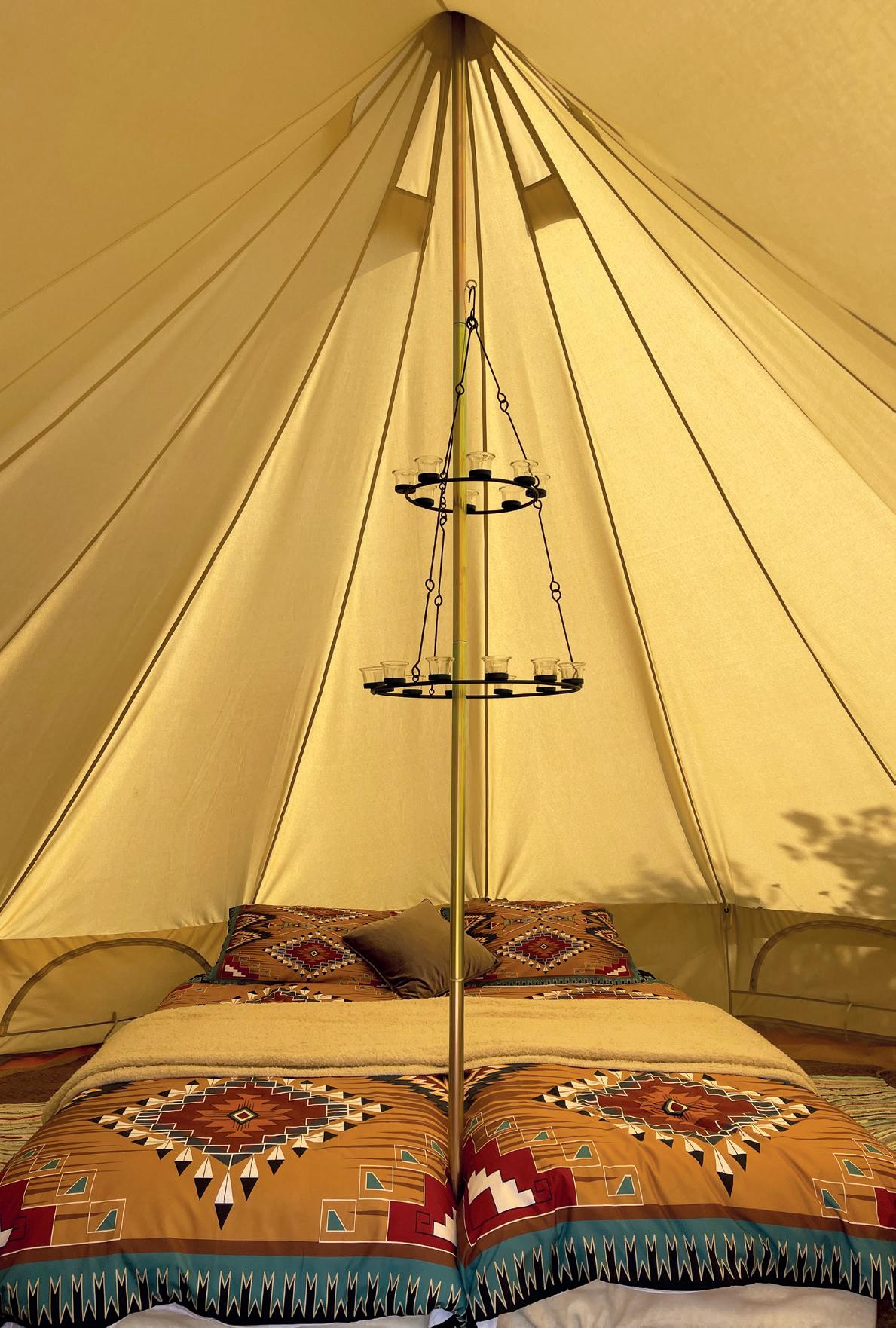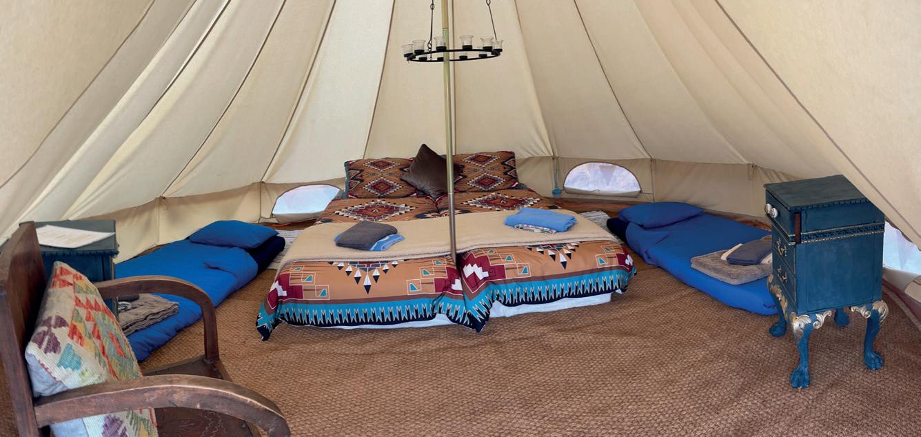 The giant four-metre bell tents (named Navajo and Apache appropriately) sleep two in complete comfort, while there are additional smaller tents for children to sleep in, or simply play.