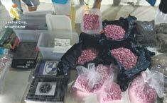 Brit gang arrested in Ibiza in Spain’s biggest pink cocaine seizure there to negotiate a fresh sup ply of drugs. The Guardia described it as an 'important criminal or ganisation' operating on Ibiza and received help from the UK National Crime Agency as well as Europol, Interpol, and the Colombian police. Be sides the pink cocaine and the money, Operation Via Fora raids yielded 16.4 kilos of co caine; 5.6 kilos of ketamine and marijuana; and 87,000 ecstasy tablets, three hand guns and a sub-machine gun with a Luxurysilencer.watches and 11 cars have been impounded along with numerous mobile phones, computer terminals, and Policedocumentation.saidthatthe gang was extremely violent and used the guns to steal drugs from other gangs, as well as for ‘protection’ when distributing narcotics to ‘retailing’ organ isations. Pink cocaine is a popular de signer drug that is often used on the club and party scenes because of its stimulant effect and psychoactive properties.