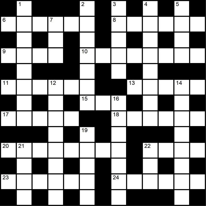 Across: 6 Tattoo, 8 Evolve, 9 Marc, 10 Effusive, 11 Joshua, 13 Seuss, 15 Dab, 17 Fatal, 18 Eddies, 20 Alcatraz, 22 Hawn, 23 TV show, 24 Nation.