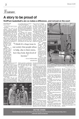 tends to get the most attention. “There’s just no balance [in the media coverage],” Ju said. “They fail to show the other side of it. There’s so much hope in the community. There’s community – like a true sense of community – and there’s real life down there. That, people just don’t realize.” So while Ju’s focus right now is on basketball, she also has aspirations of working in some of the marginalized communities on Vancouver’s Eastside. She dreams of being able to bridge the gap between the east and the west of Vancouver, removing through education some of the animosity people have for each other. She’s attacking the stereotypes academically. She’s currently waiting to hear if her proposal for TRU’s Undergraduate Research and I n n o v a t i o n Conference has been accepted. Her topic: The portrayal of the Downtown Eastside of Vancouver in literature. “I think it’s a huge issue in our society —Jen Ju, WolfPack athlete that people refuse to help, or see people as and much more human beings due to their status, how they with her personal or professional look, their level of income,” Ju said. goals and the way people interacted “I really am passionate about things with each other she was used like that.” But she doesn’t restrict her efforts to – everything seemed a little to an academic approach. She’s also individualistic. doing it with basketball, coaching It was also incredibly expensive. In the end, things worked out inner-city youth. She works with a great for the WolfPack and TRU. number of programs, most of which Ju is a model teammate and a great are aimed at those who wouldn’t player. She’s also made it a priority be able to afford the financial to do some pretty powerful things commitment of youth programs at places like SFU or UBC. She works in the communities she’s lived in. She grew up in Vancouver’s with other grads from Britannia lower Eastside, in Strathcona, a and the Strathcona area, as well as community near Hastings Street. the Real Basketball League. Jen Ju It’s an area that’s often mentioned is paying it forward. “We always have a philosophy in the same breath as poverty, drugs, prostitution and Robert as a women’s basketball program Pickton, but that’s just one side of that we want to not forget where it. Unfortunately it’s the side that we came from and we want to be able to give back if we are able to do so,” said Scott Reeves, head coach of the women’s basketball team at TRU. “For her to be able to do that back in her hometown where she came from, I think would mean a lot to her because someone did that for her when she was young and that’s the type of person that she is.” Ju feels she’s able to relate to youth through humour and their shared life experiences – it’s a skill set she’s quite proud of. For her, basketball is more than just a game – it’s a sport that teaches a lot of life-skills youth don’t learn inside a classroom. As the basketball season ends, much of the media attention has been on the end of Diane Schuetze’s career and for good reason. Schuetze is top-25 in alltime CIS scoring and has been a significant cog in the WolfPack’s —PHOTO BY ADAM WILLIAMS to accomplish whatever I needed to in order to play basketball.” Ju says in recent years her parents, particularly her father, have grown to be more accepting of her decision to play basketball and have internalized her love for the game. It’s not a complete 180, but it’s a start. Ju graduated from Britannia Secondary School in Vancouver and started her post-secondary career at Santa Barbara City College in California. Playing in the U.S. didn’t end up being a good fit, so she came back to Canada the next year. It was a good learning experience and she has a lot of great memories, but it didn’t align