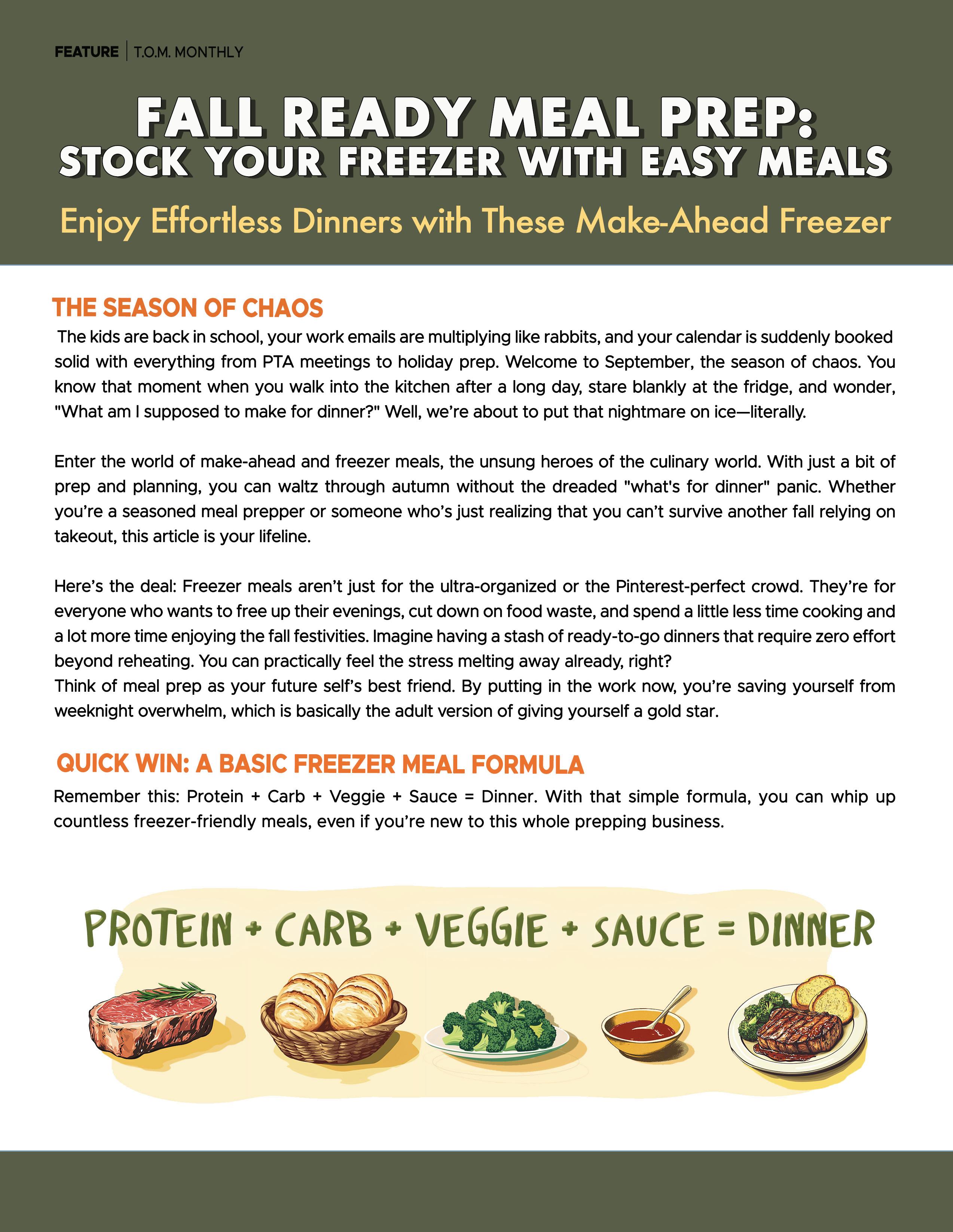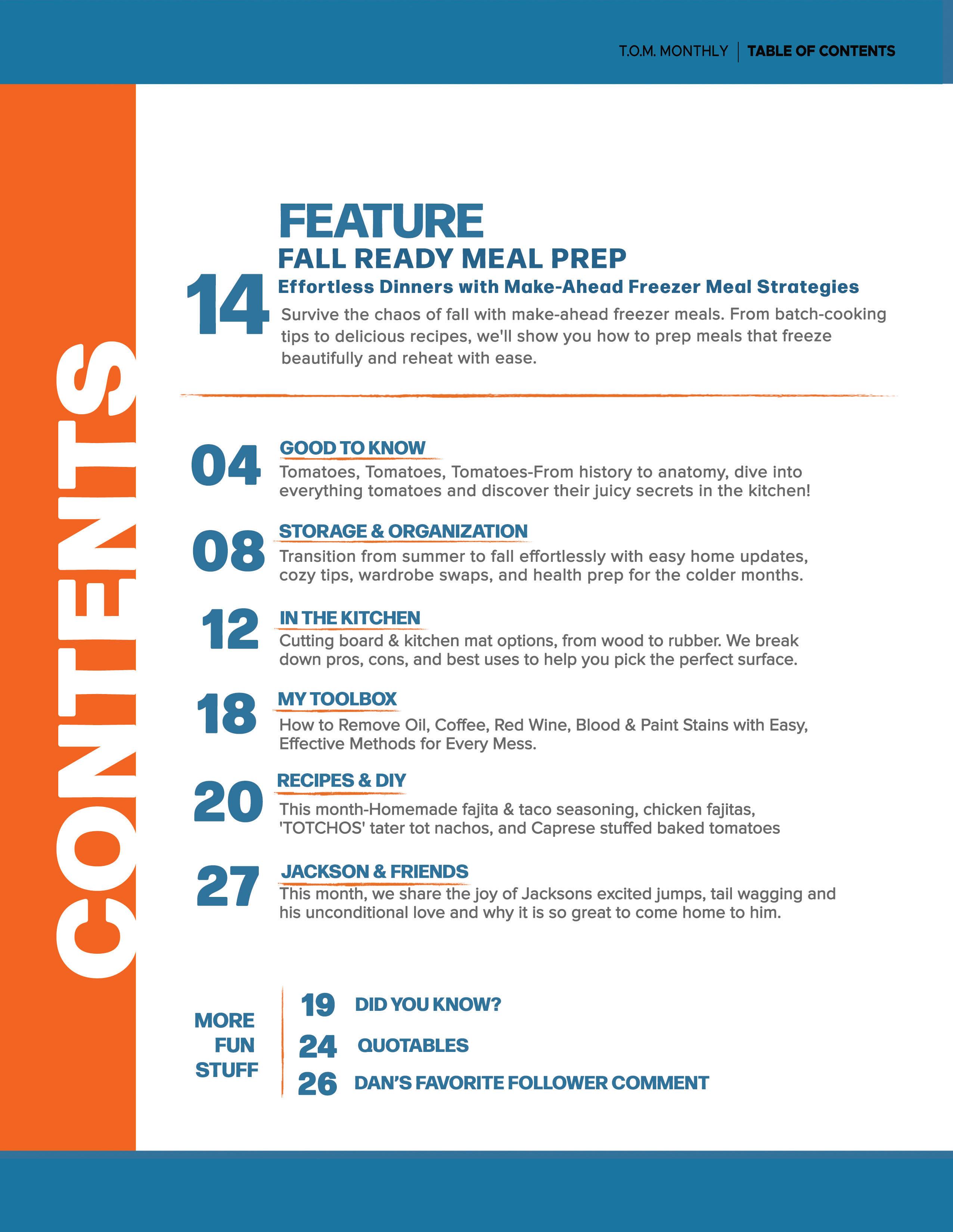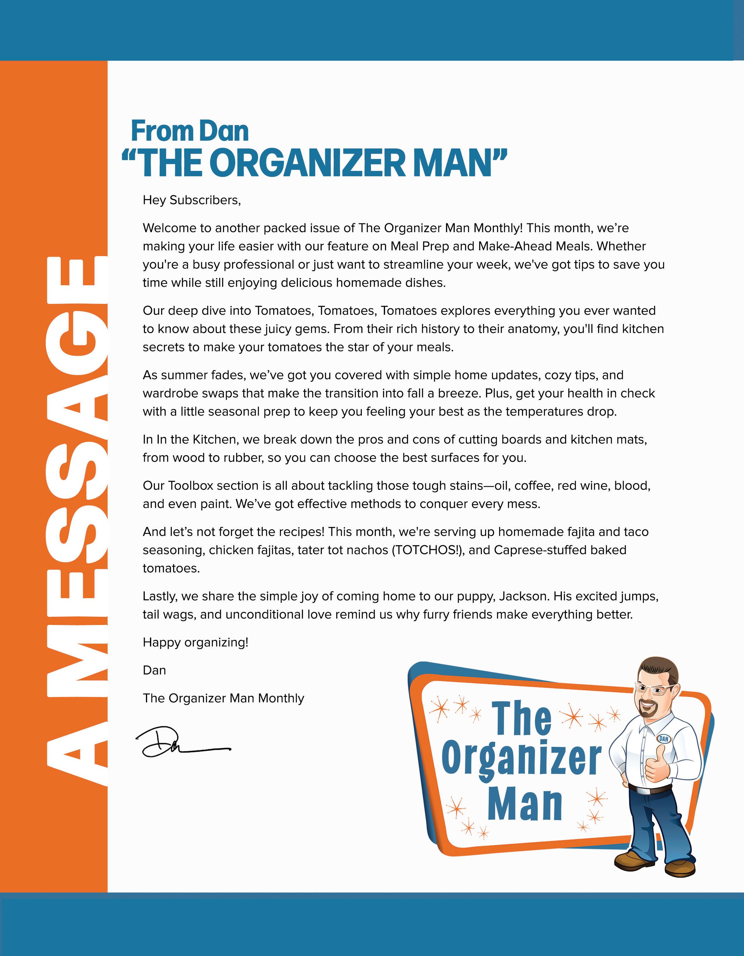 September's issue of THE ORGANIZER MAN MONTHLY is all about prepping for fall! From "Tomatoes, Tomatoes, Tomatoes," where we spill kitchen secrets, to mastering make-ahead freezer meals for easy weeknight dinners, this issue has it all. Transition smoothly from summer to fall with cozy home updates and wardrobe swaps. Find the perfect cutting board for your kitchen, tackle tough stains, and whip up recipes like homemade fajita seasoning, TOTCHOS, and Caprese stuffed baked tomatoes. Plus, celebrate the joy of coming home to Jackson’s excited jumps and tail wags. Get organized, cozy, and ready for fall!