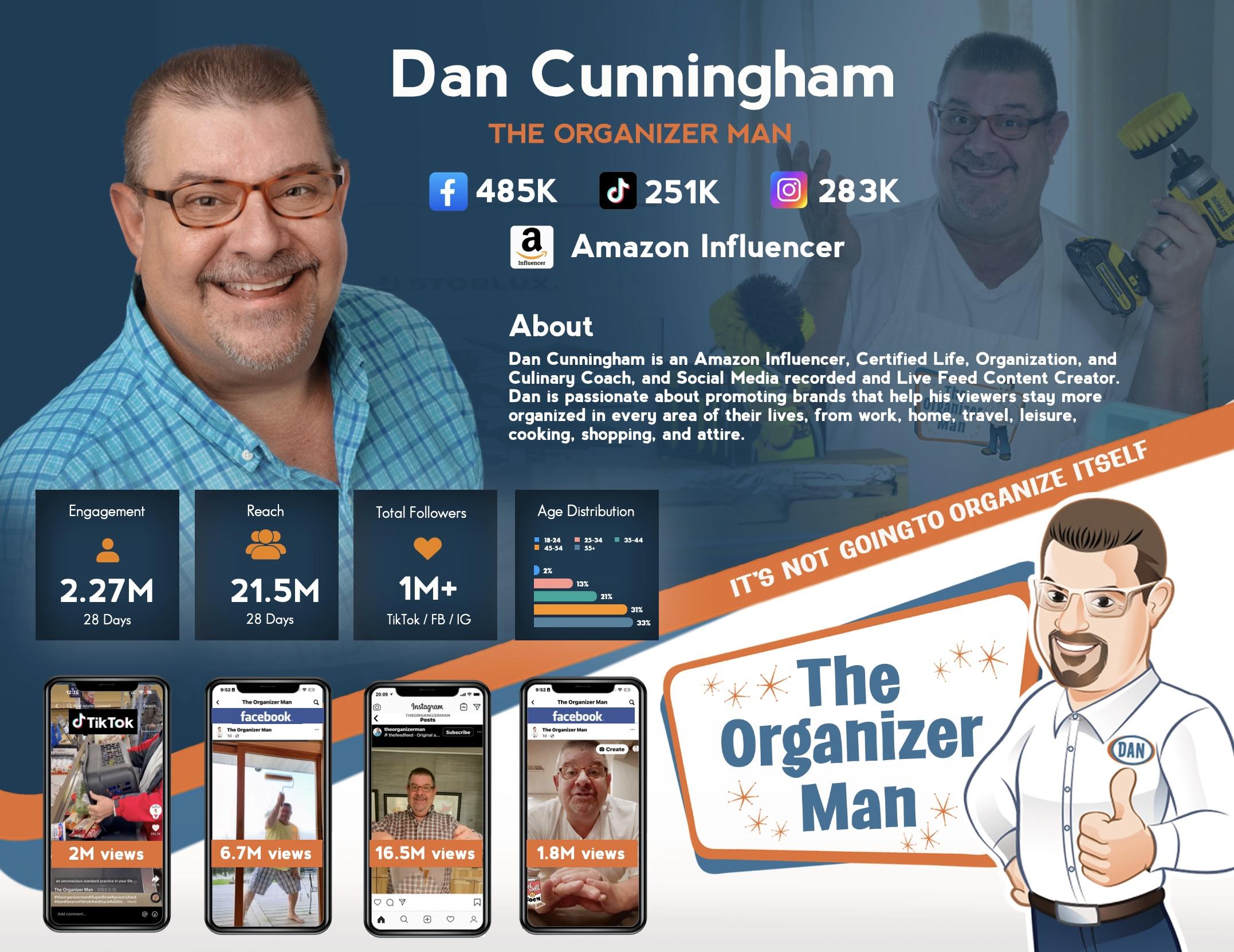 Dan Cunningham, aka "The Organizer Man," shines as a social media influencer on platforms like Facebook, Instagram, and TikTok. His vibrant personality and engaging content foster a community focused on personal organization, productivity, and personal growth.