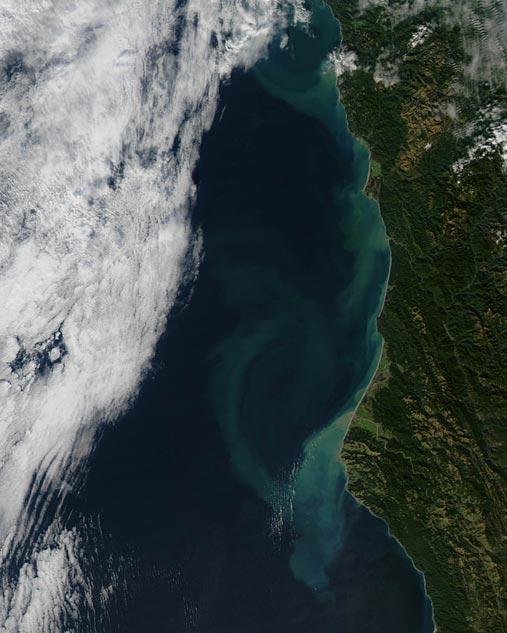 A satellite photo shows sedimentation from Eel River reservoirs off the California coast.