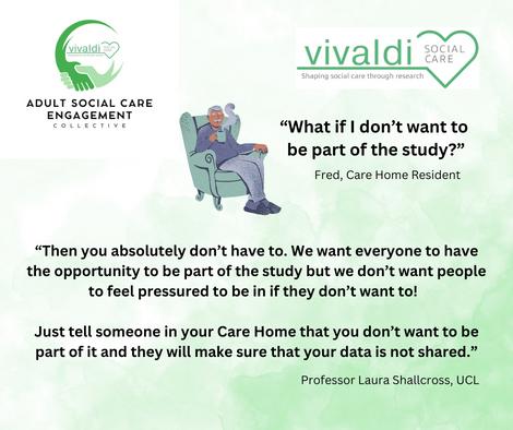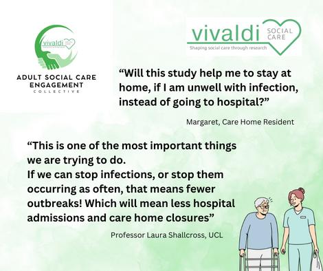 Thank you to everyone who joined our Adult Social Care Engagement Collective meeting for a VIVALDI Social Care Project Update on the 14th Jan where we were joined by Professor Laura Shallcross from UCL, Maria, Graeme, Kate and Diane from Rights for Residents, and we were delighted to also be joined by Caron and residents- Caring Homes, Kim, Tea and residents- Cavendish Park- Majesticare, Mr. Fredrick Palmer (resident) with Paige - The Close Care Home and Amanda at Risedale Nursing Home and residents.