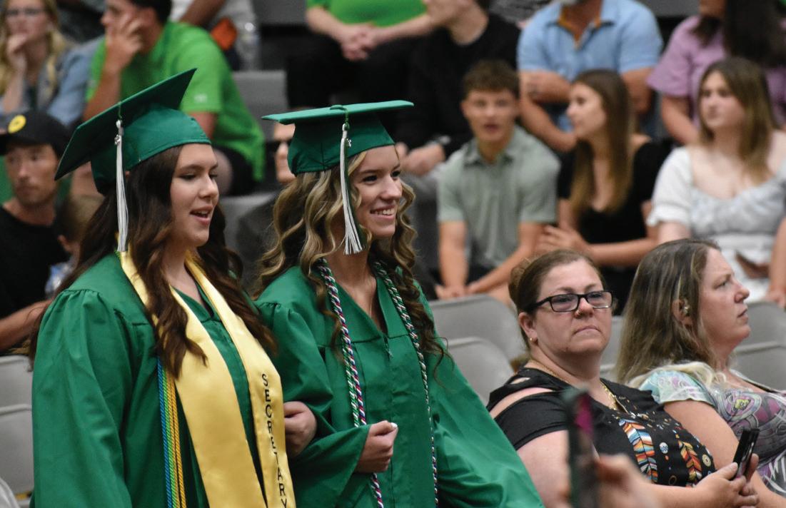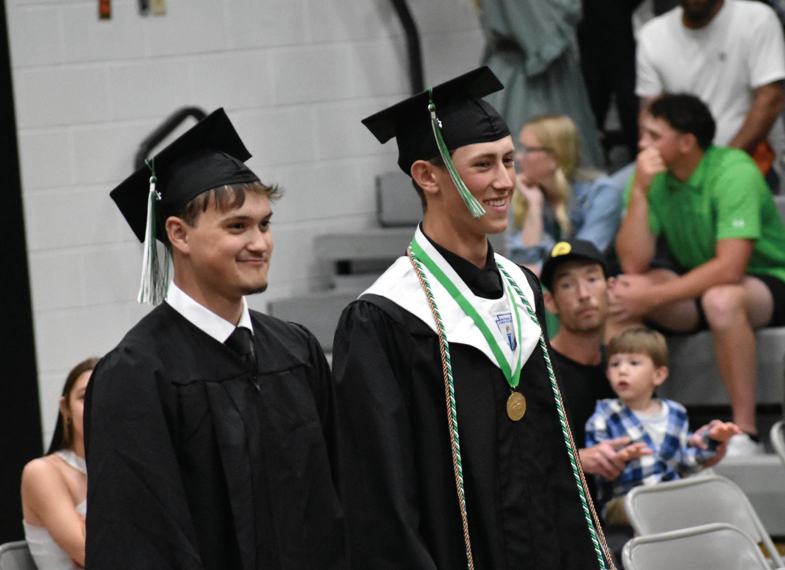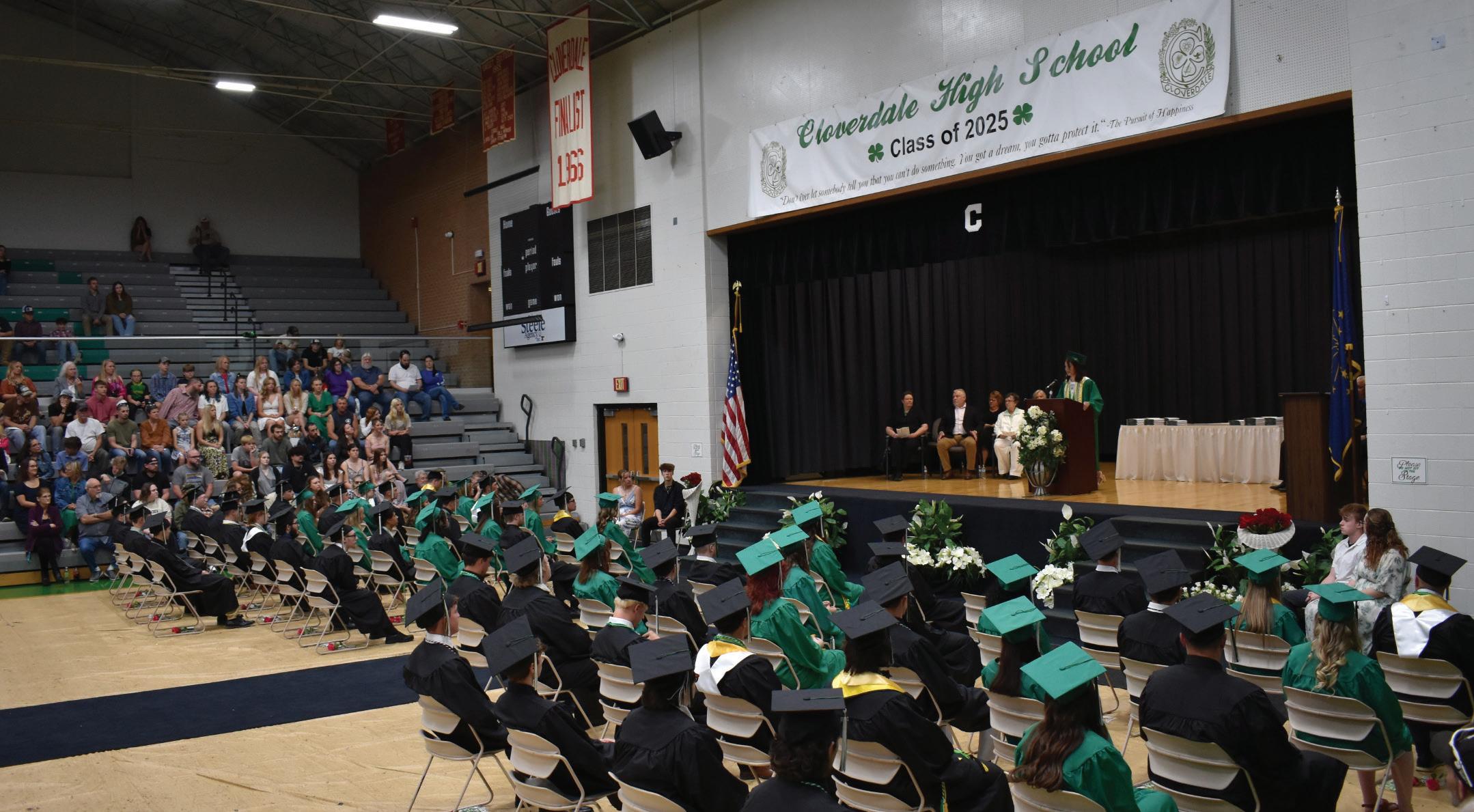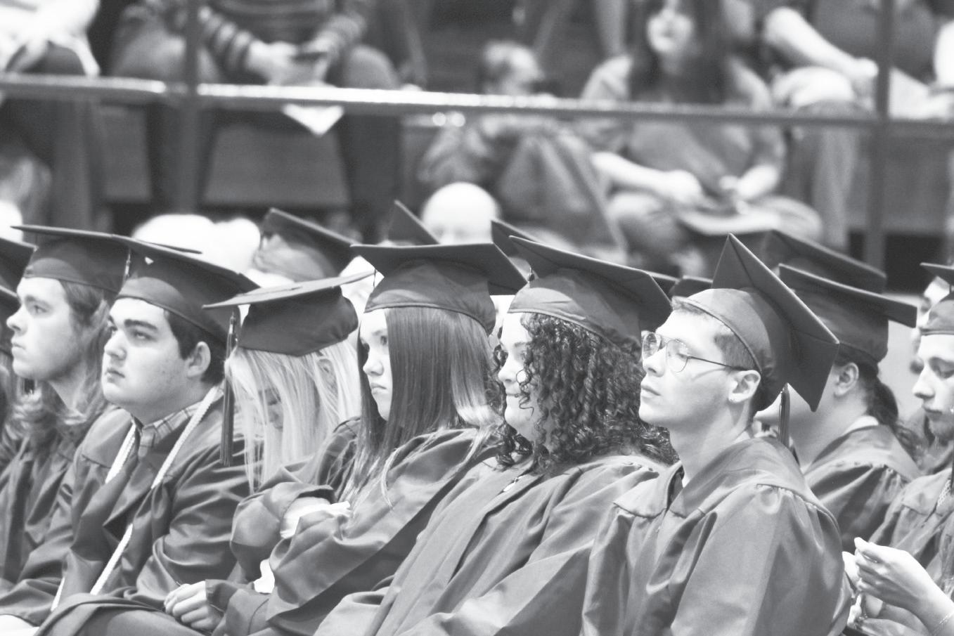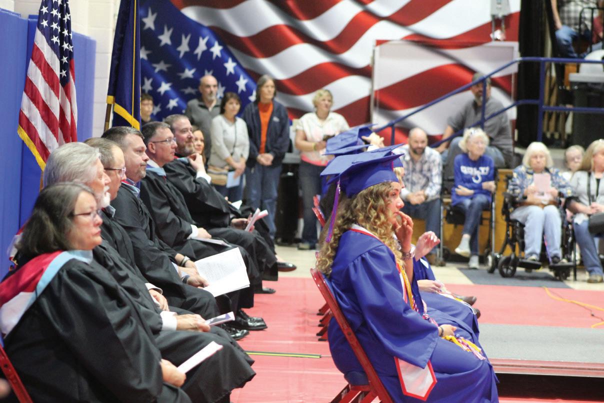 Members of the Owen Valley High School class of 2025 listen to keynote speaker County Councilman Anton Neff. Neff graduated from OVHS in 1995.