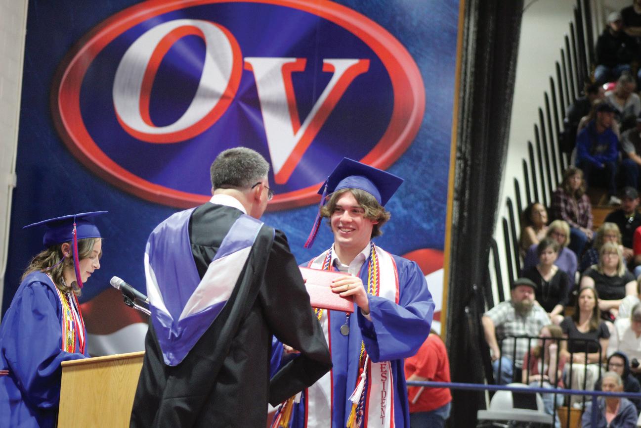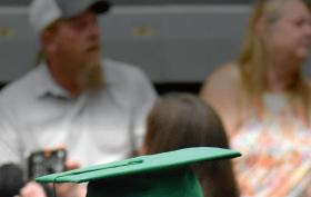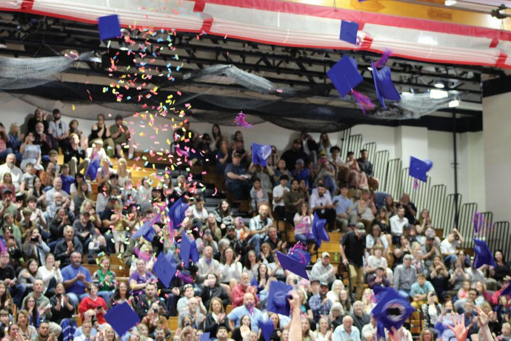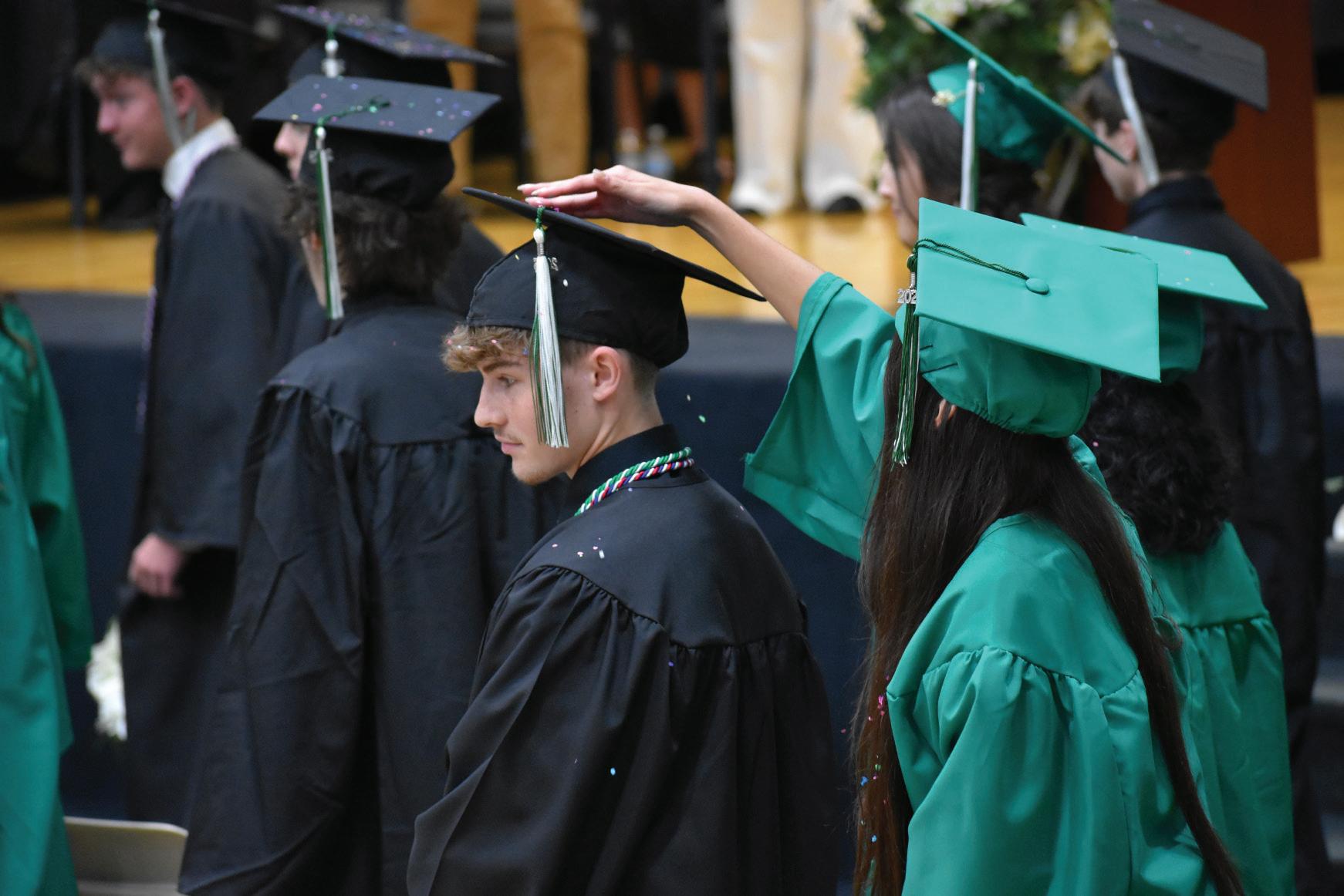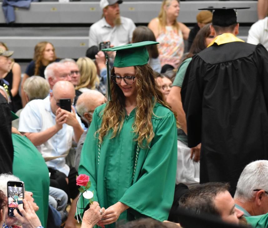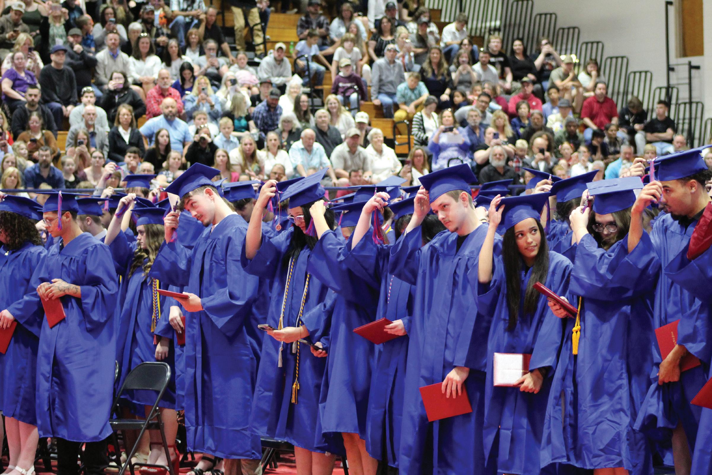 Members of the Owen Valley High School class of 2025 listen to keynote speaker County Councilman Anton Neff. Neff graduated from OVHS in 1995.