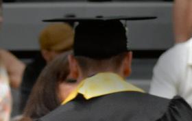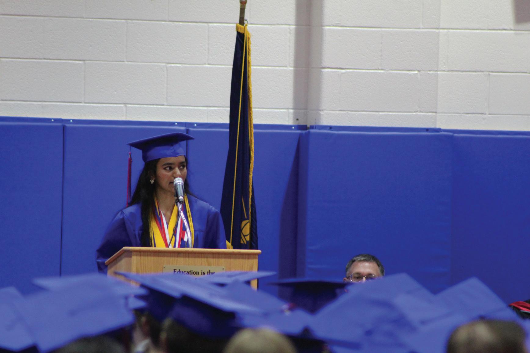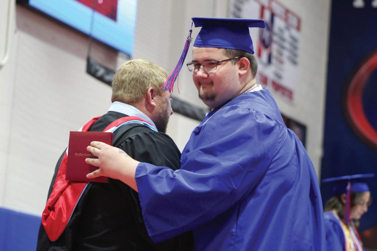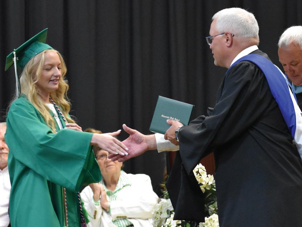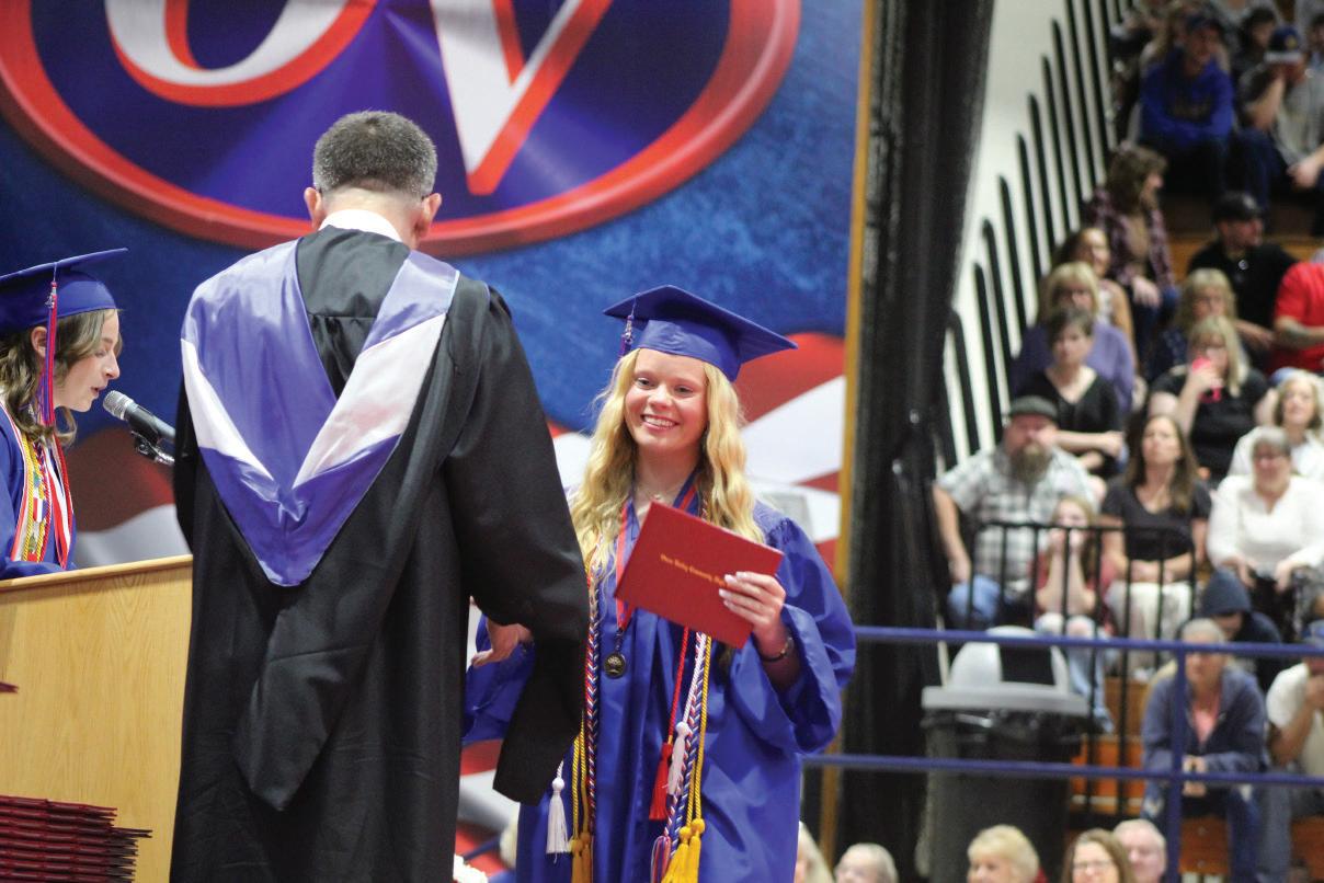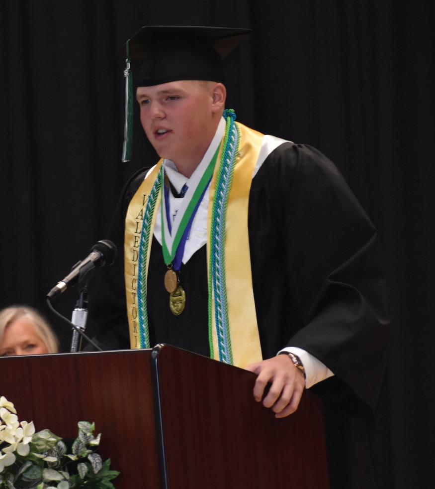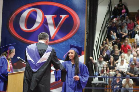 Members of the Owen Valley High School class of 2025 listen to keynote speaker County Councilman Anton Neff. Neff graduated from OVHS in 1995.