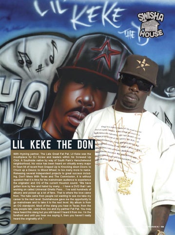 LIL KEKE THE DON With rhyming partner, The Late Great Fat Pat, Lil Keke was the mouthpiece for DJ Screw and leaders within his Screwed Up Click. A Southside native by way of South Park’s Herschelwood neighborhood, his voice has been heard on virtually every major H-Town hit of recent from Draped Up to Knocking down Doors; to Chuck up a Deuce; to Wood Wheel; to too many more to name. Releasing several independent projects to great success including, Don’t Mess With Texas and The Commission, it is without question that it is time for the mainstream audience to experience the originator and OG of the current Houston sound. “We have gotten love by few and hated by many… I have a DVD that I am working on called Universal Ghetto Pass… I’ve sold hundreds of albums and picked up a lot of fans. That is where the love came from. The hate came from people not wanting to see me take my career to the next level. Swishahouse gave me the opportunity to go mainstream and to take it to the next level. My album is from an OG standpoint. Most of the slang you hear in Texas, from the way people talk, came from me and my partner Fat Pat. You may have heard this slang but you still haven’t heard it from me. I’m the forefront and until you hear me saying it, then you haven’t really heard the originality of it.” 3rd Edition • Hustlenomics • 91