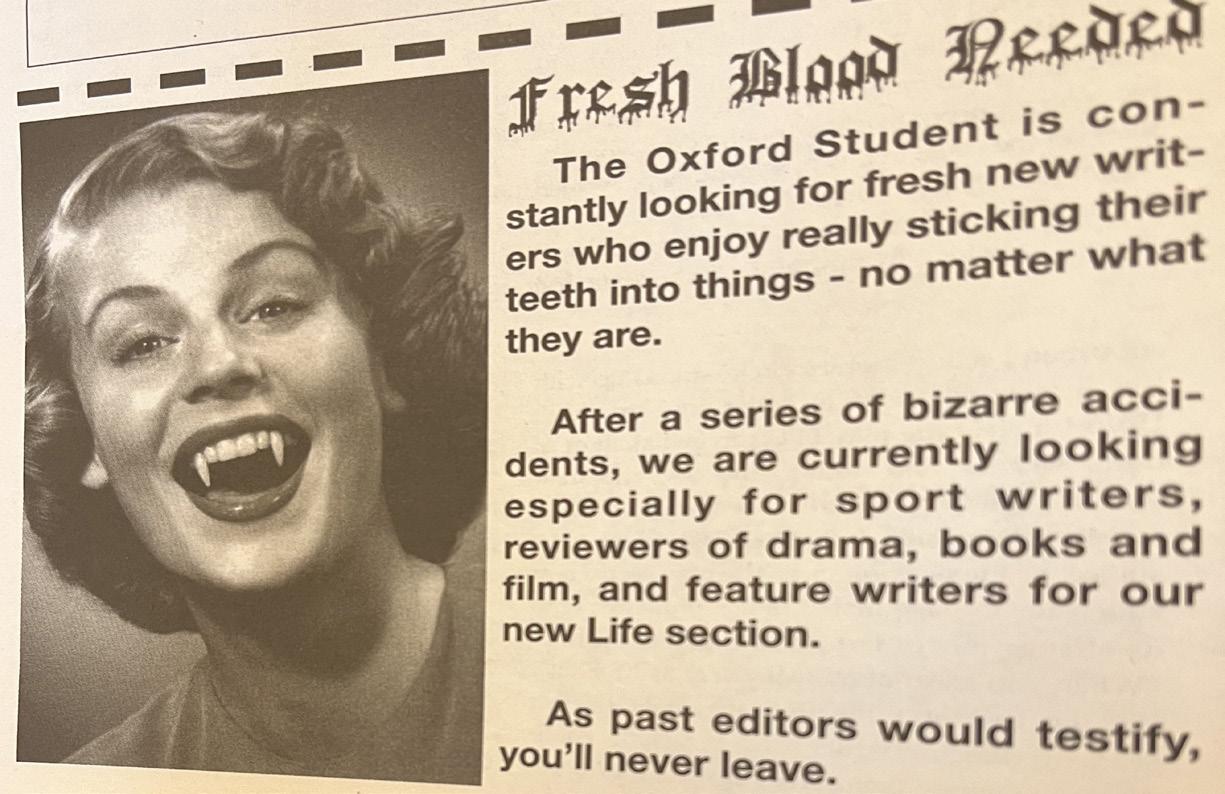 Such dedicated team members can only be found through regular recruitment drives. In the modern day this mostly happens via social media, but in days gone by the OxStu was no stranger to an in-paper advertisement for new staff. Some of these were rather out of the box and eye-catching, as we shall see.