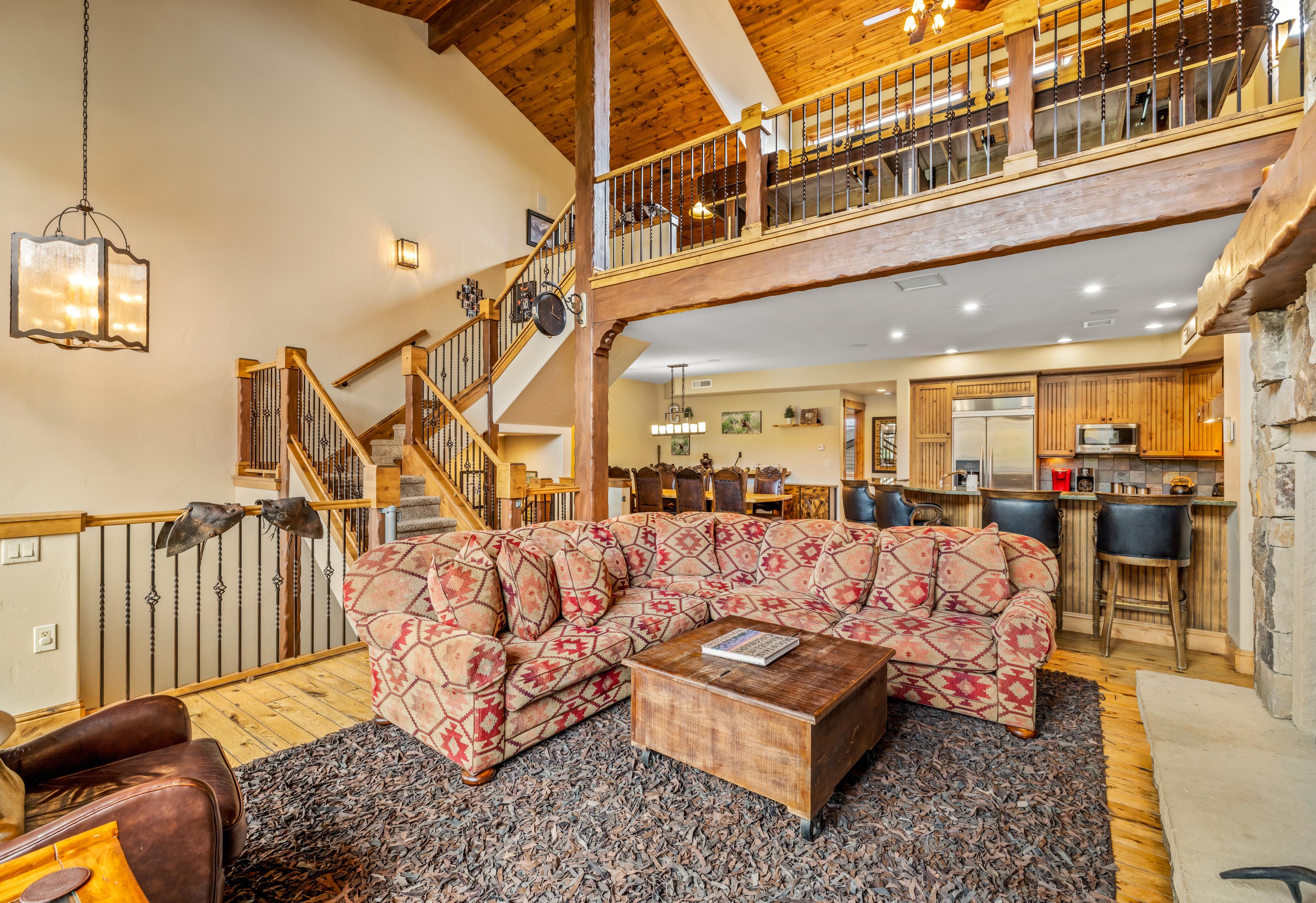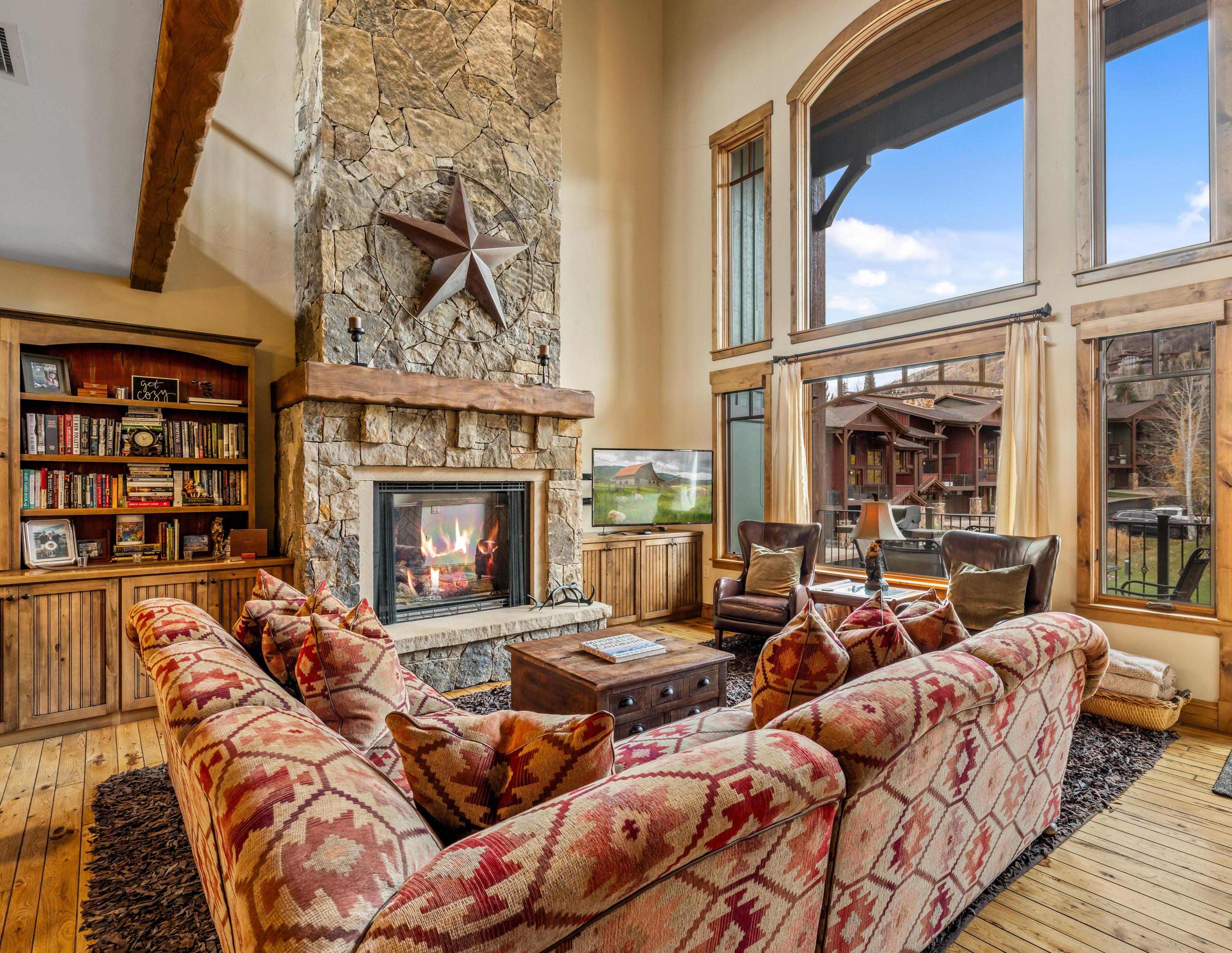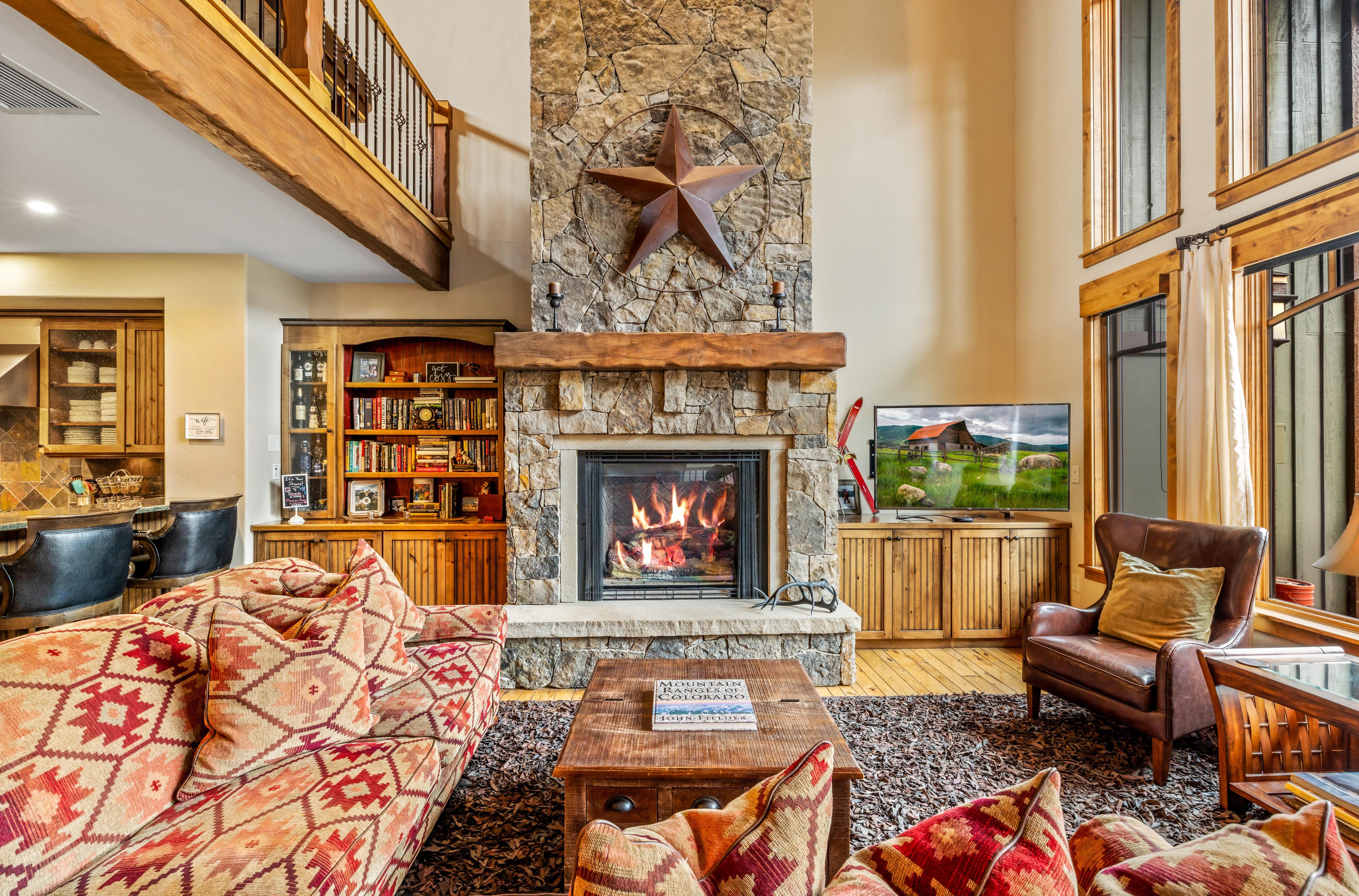 Ascend to the main living level, where an impressive great room features 30-foot vaulted ceilings and a hand-crafted, floor-to-ceiling stone fireplace, constructed by masons brought in specifically for this home, serving as a dramatic architectural focal point. Floor-to-ceiling glass frames ski area views and opens to a covered deck with a grill, dining area, and 7-person hot tub, positioned for après-ski evenings with alpenglow views.