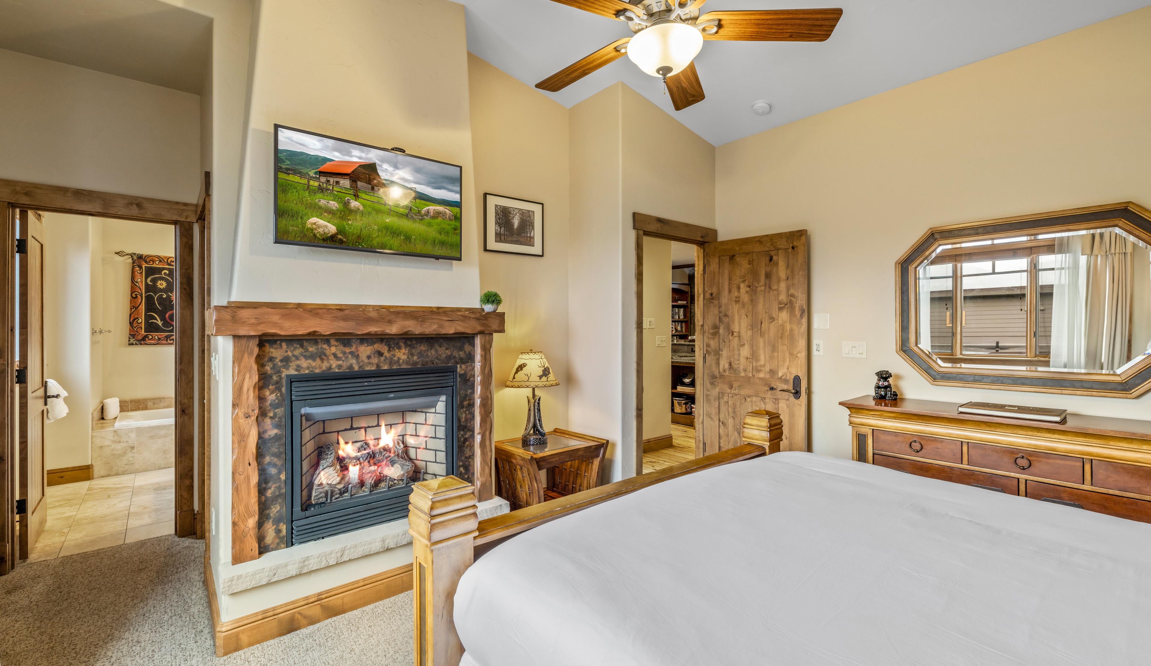 The primary suite on this level offers a private retreat with fireplace, walk-in closet, dual vanities, soaking tub, and walk-in shower.