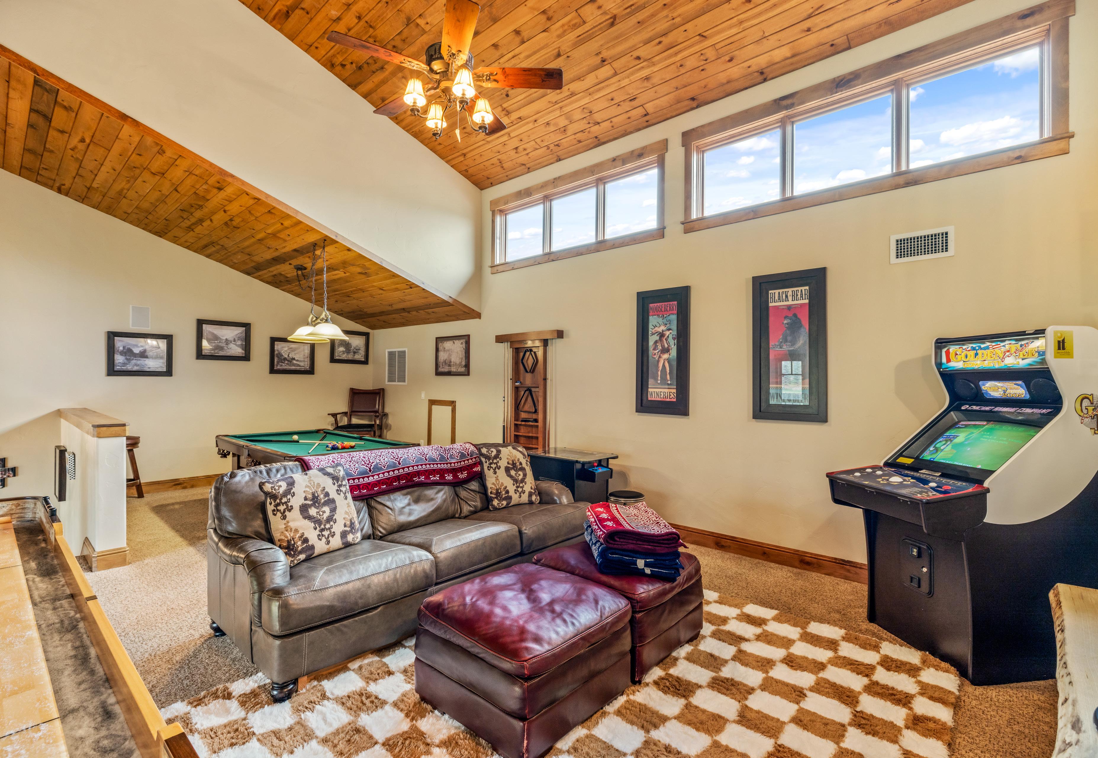 Above the great room, a lofted game and lounge area provides a second living space or sleeping quarters.