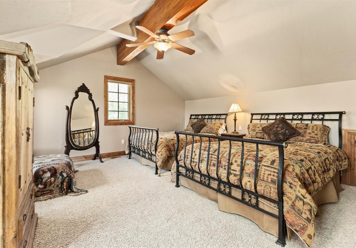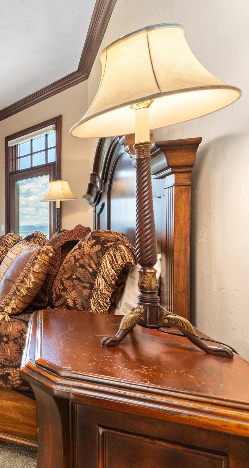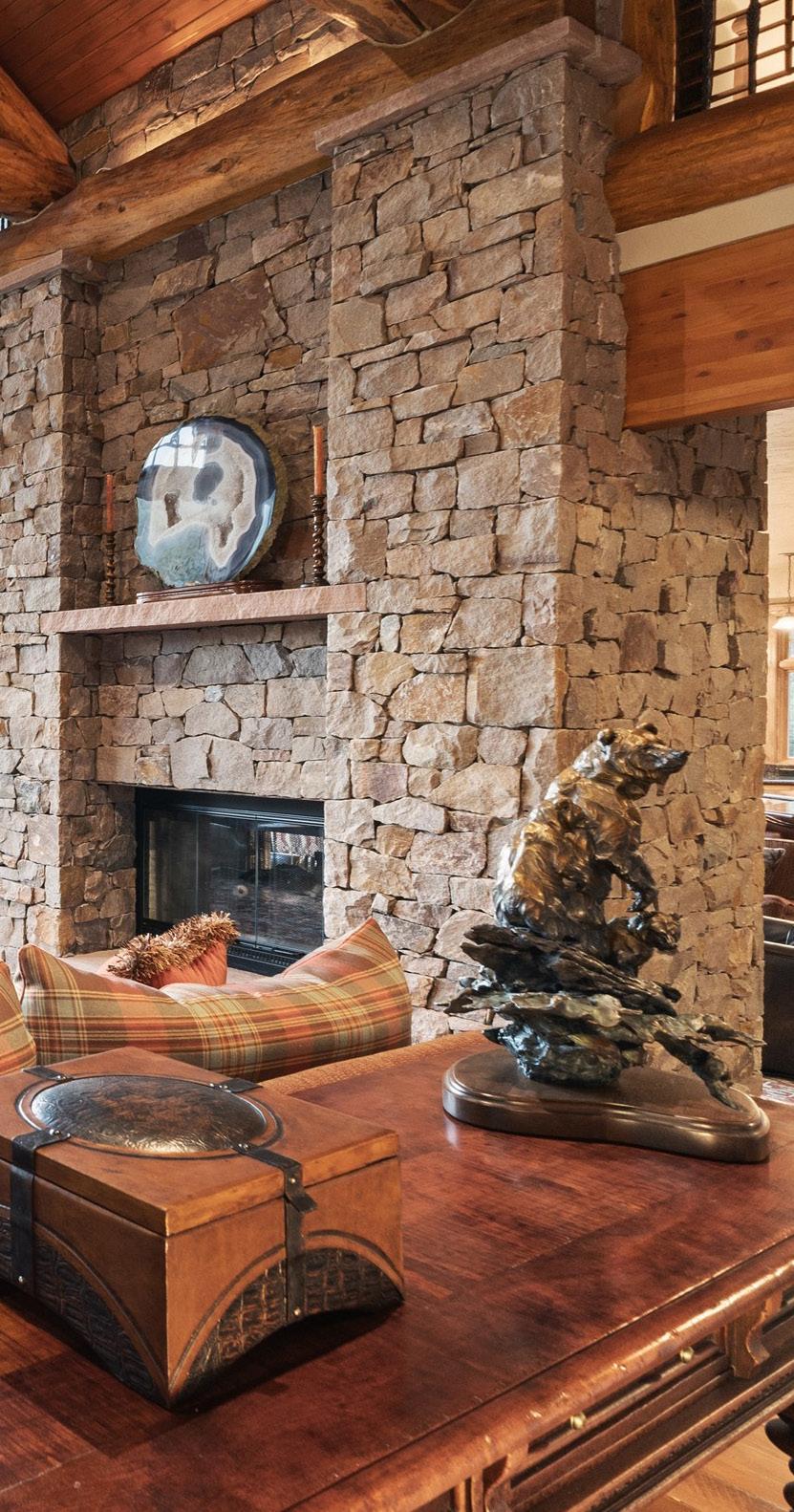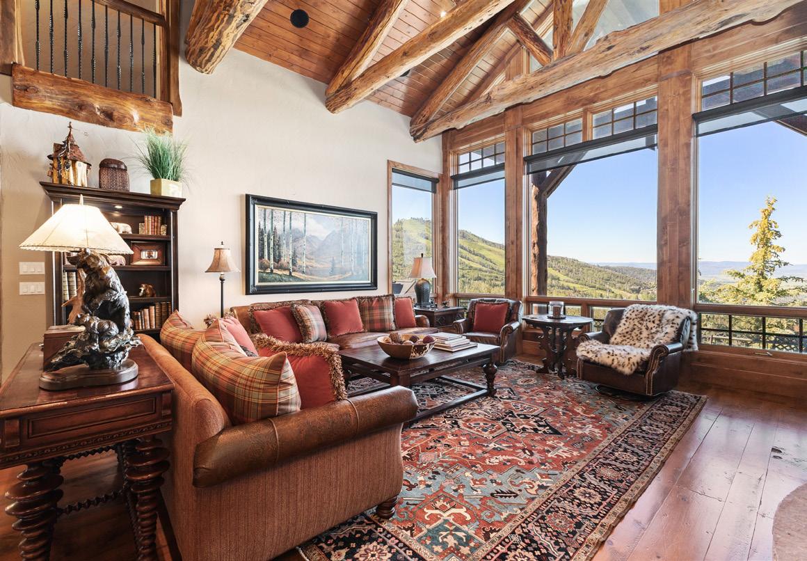 Primed for all-season use, the estate’s exterior presents a recently renovated deck with a hot tub, perfect for enjoying the breathtaking scenery. Inside, log accents and high vaulted ceiling enhance the home’s spacious, woodsy feel. The chef’s kitchen is equipped with stainless steel appliances, granite countertops, a Wolf 6-burner stove, double oven, and SubZero refrigerator. The primary suite presents a fireplace and two separate closets, while other bedrooms are equally spacious, accommodating multiple beds and sitting areas.