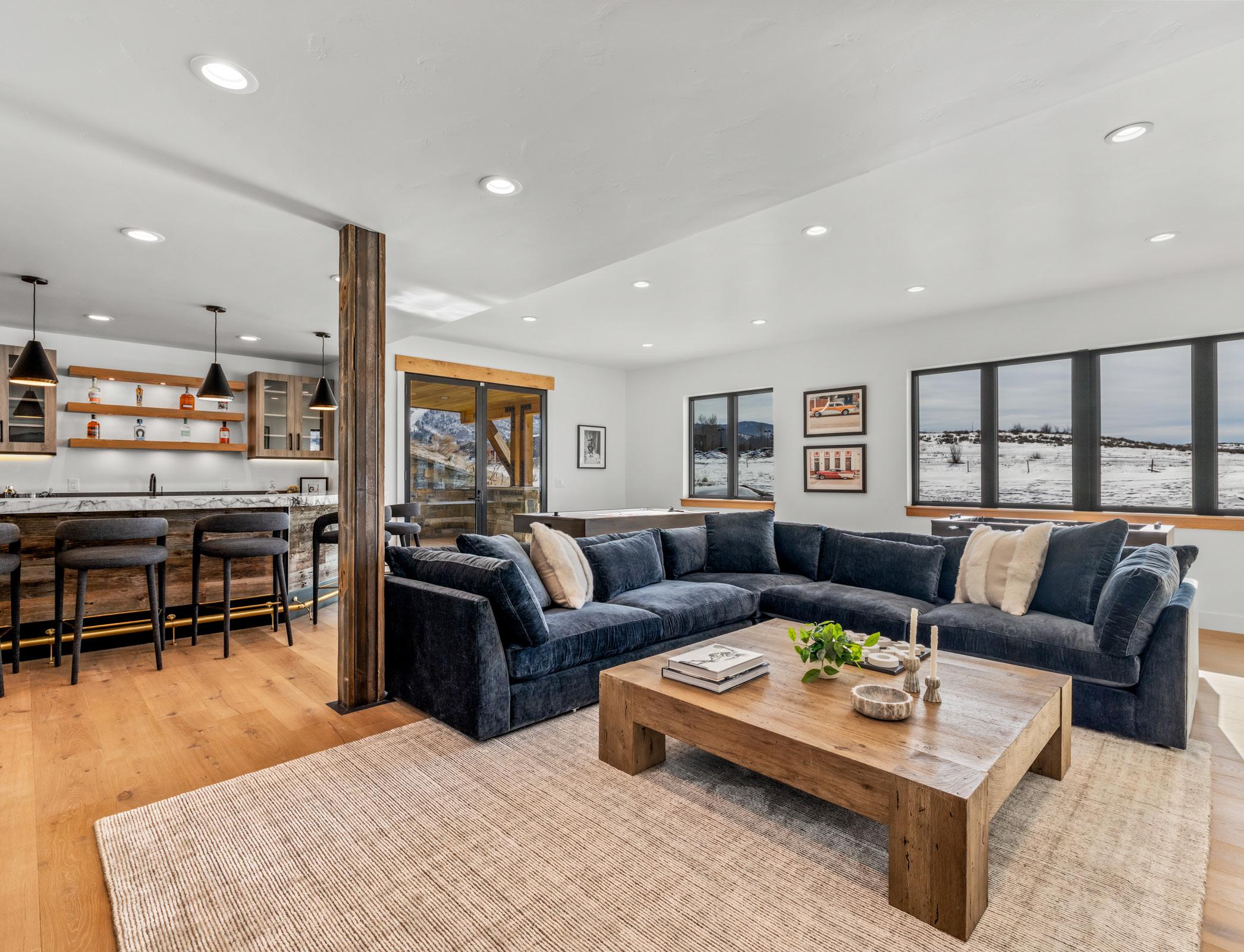 The game room offers an under-lit quartzite bar, beverage refrigerator, dishwasher, and adjacent wine room for effortless entertaining.