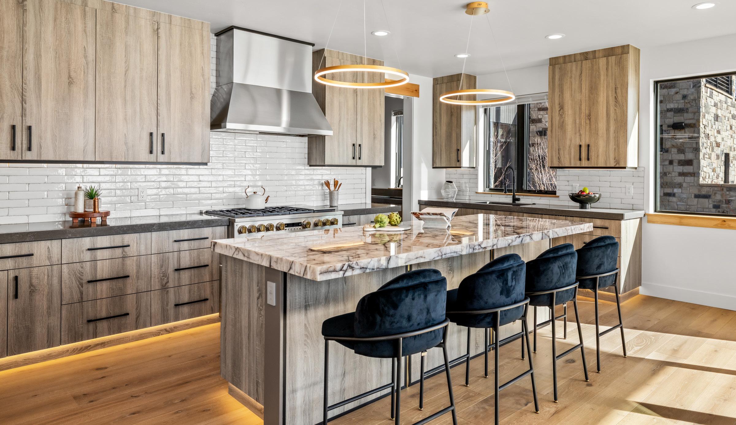 The gourmet kitchen showcases a dramatic Crystallos Sloages quartzite island, GE Monogram appliances, wine refrigeration, pull-down shelving, and a butler’s pantry with sink.